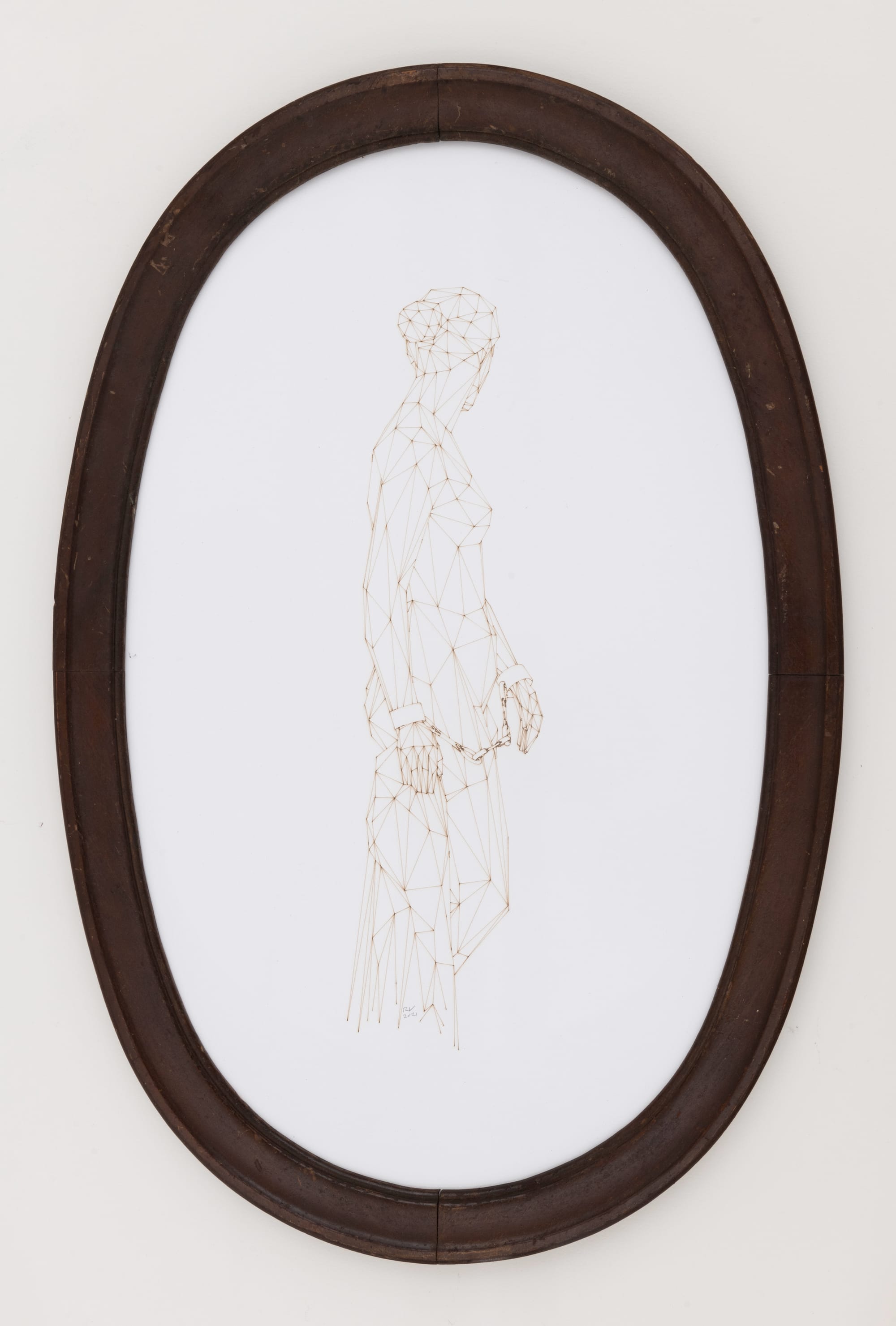 Visani is more subtle. His figures trace a bare outline, almost there, almost not — humans in an early version of computer-aided design (CAD). In "A New Tomorrow" (2021) the figure is not fully visible, not fleshed out, but her hands are shackled in front of her, and half turning, she looks back over her shoulder. With figures set in antique frames, they suggest that Visani is looking back as well, half turning towards a past were ancestors of his were put in chains. Being drawn this way, the figures look concocted out of a mix of personal memory and the digital representation of that memory — a whisp of a recollection resurrected by an algorithm. It's also important to note that the form and figure is that of the "Greek Slave" a marble sculpture carved by Hiram Powers in 1846. Thus the artist both suggests the continuance of a tradition of representation and its evolution.