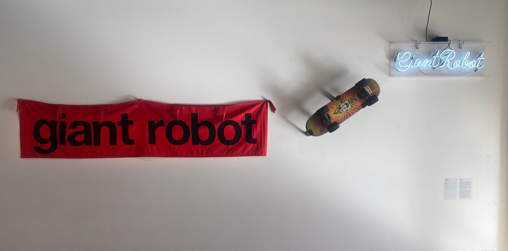 The skateboard Wong took around Manzanar hangs on the wall of Oxy Arts, the public art center of Occidental College. The skateboard, copies of Giant Robot, and a music video of The Linda Lindas, alongside cardboard cutouts from the video, are some of the works in Voice a Wild Dream: Moments in Asian America Art and Activism, 1968–2022, curated by Occidental Professor of Practice Kris Kuramitsu.