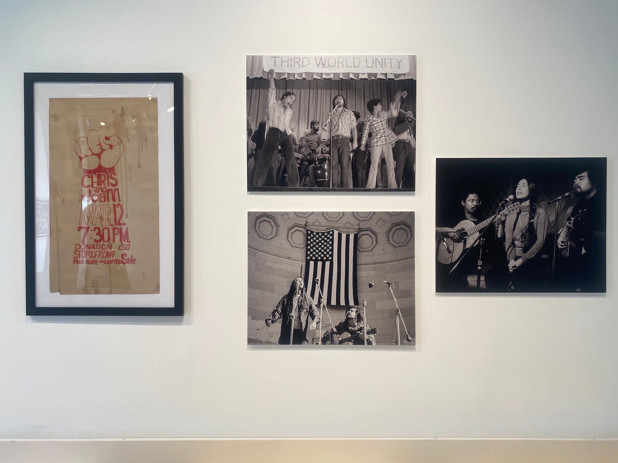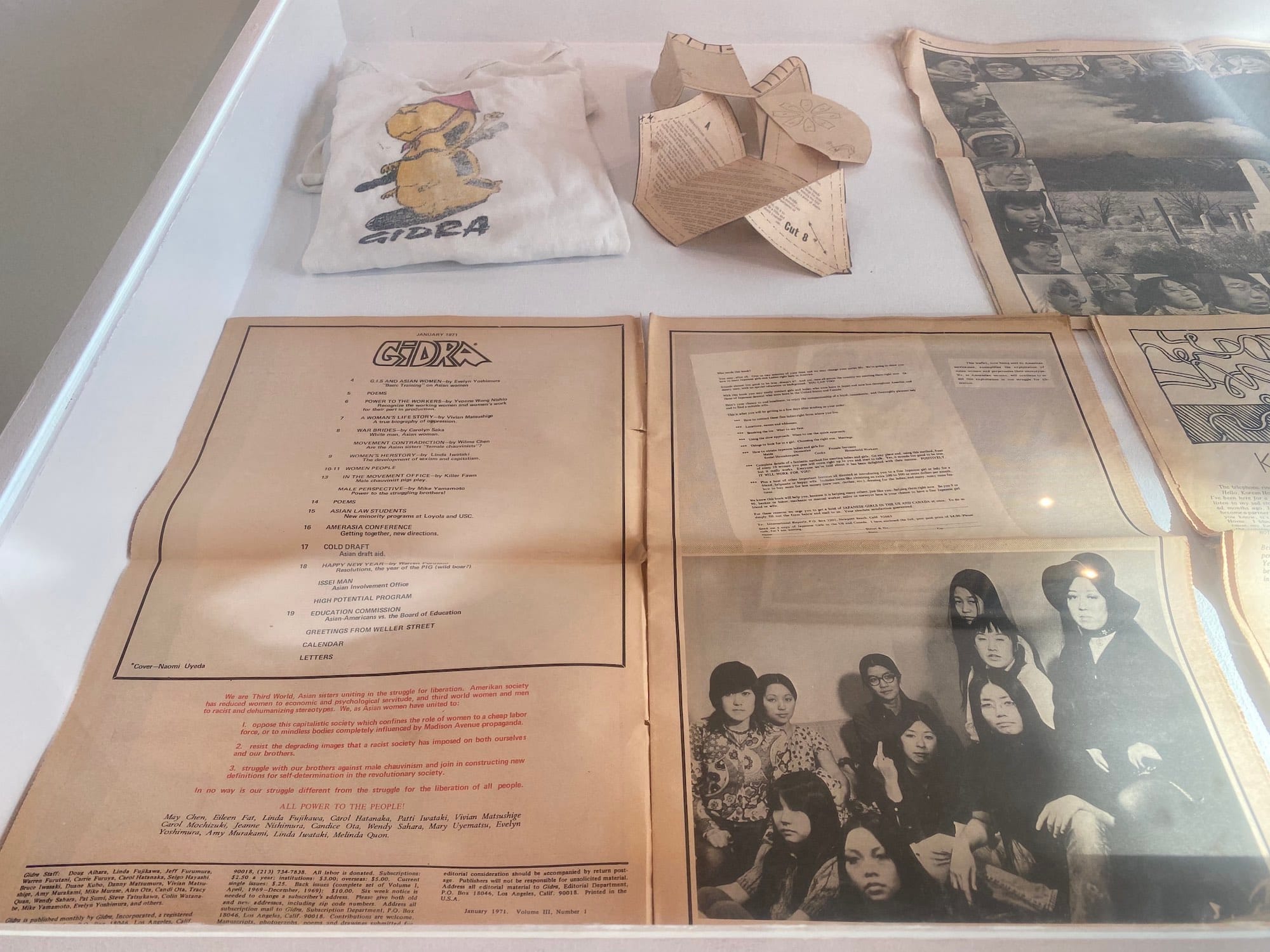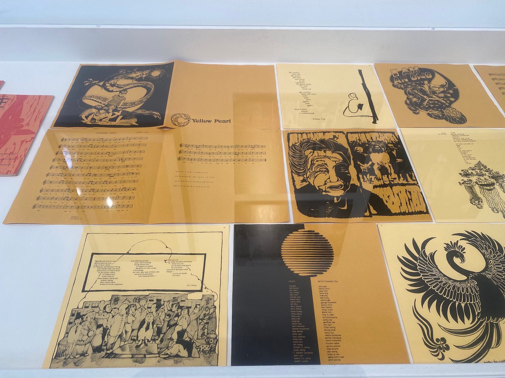 Gidra, whose bold covers hang from the ceiling at the gallery entrance, documented West Coast Asian American experiences in the heady days of the Vietnam War and Civil Rights movements of the time. Named after a three-headed dragon from Japanese monster movies, the magazine covered politics and society alongside art, poetry, and culture. Bridge, on the other hand, documented the East Coast scene, and was published alongside Yellow Pearl, a set of prints inspired by the album A Grain of Sand: Music for the Struggle by Asians in America.