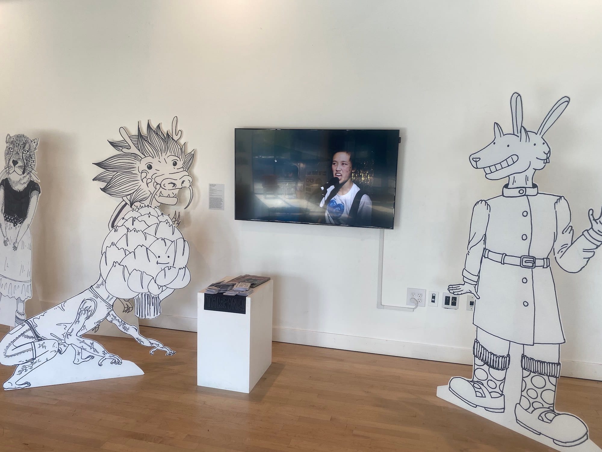 Where Voice a Wild Dream succeeds is in beautifully documenting and showcasing how the contemporary moment of Asian American activism is rooted in decades of work by media makers, artist collectives, and musicians seeking to document and express Asian American experiences in the face of oppressive structures. Indeed, one electronic work, titled “Asian American Art Activism Relationship Map, 2022,” by Yvonne Fang and Alexandra Chang, aspires to map these webs of relationships across time and space through a website and sheets of paper at the exhibition. The result is a series of clusters around major hubs, like Godzilla: Asian American Art Network and the Asian Arts Initiative. The focus on collectives is essential, as it dismantles the idea that activism is driven by individual charismatic figures — in reality, social change is possible because many hands come together, whether to make a punk magazine or a face mask or a viral video.
