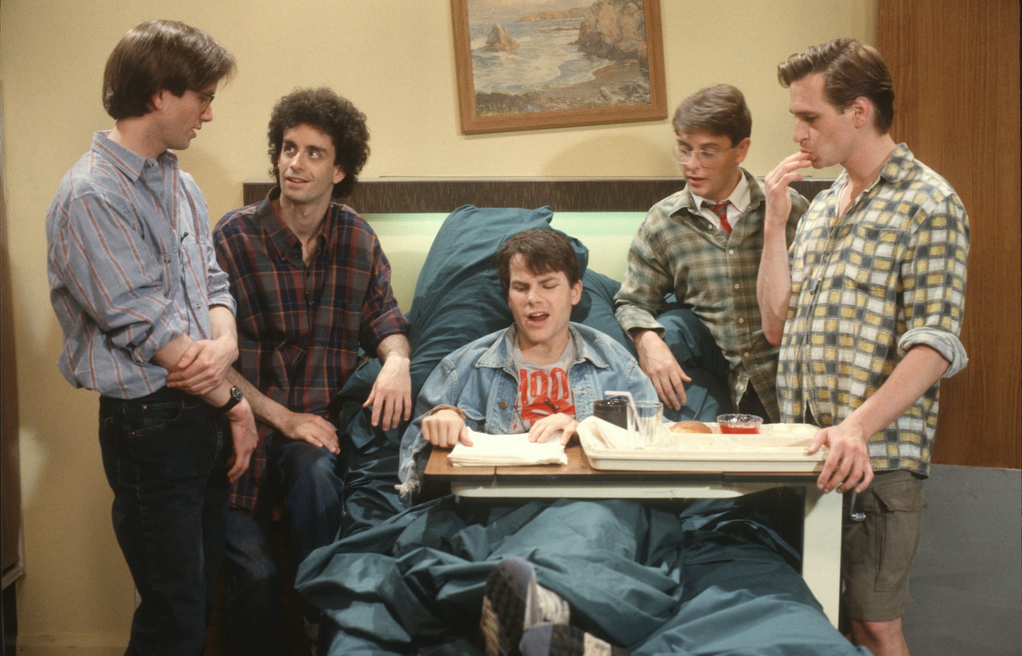At their darkest are masterworks of fine-tuned satire like the pilot’s closing sketch, “Reg,” written by Kevin, Dave, and Bruce. The troupe play a fugitive band of brothers gathered around a fire (in a baby carriage), reminiscing about their dead friend Reg. It all feels like a 20-something Stand By Me until it emerges that they ritualistically murdered him. Still, they miss him: They wish they had said more when they had the chance and they wonder where his soul is. “There are some scenes that really are the soul of the troupe,” Bruce commented of the sketch. “There’s something about that, the five of us agreeing that this is a great idea.”