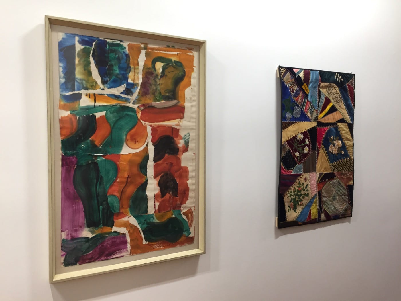 One of the most compelling conversations of the exhibition exists between “Petite,” a painting created in 1963 by Grace Hartigan, and a so-called “Victorian Crazy Quilt Fragment” made in Massachusetts in 1886. Both works possess clearly delineated fragments—I saw six parts within each work— and the quilt’s disordered lines and varied shapes certainly dialogue with Hartigan’s organic and supple forms. Another striking colloquy exists between Elaine de Kooning’s “March Sky” painted in 1959 and a “Folk Art Crazy Quilt” from circa 1885. This quilt is hung at an almost 90-degree angle to the painting, inviting the viewer to engage with both works simultaneously. Here, the similarity in color palette is most poignant.