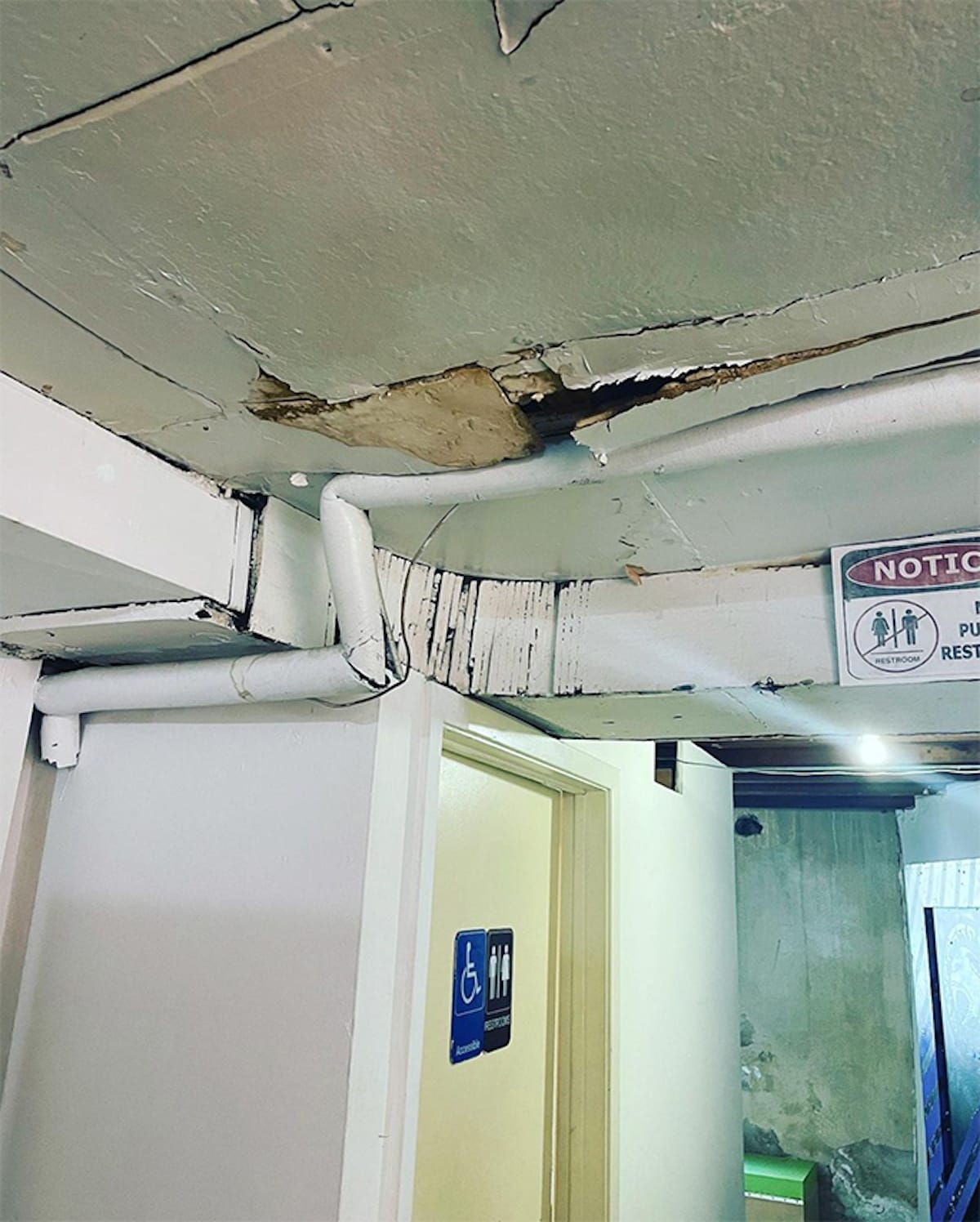 Orozco, who serves as the museum's executive director, told Hyperallergic that developers purchased the building and others on the same block in 2000. Worried they would lose the space, she worked with the City of Austin to develop an exchange agreement to buy the building. The contract stipulated that Mexic-Arte would provide services for 50 years such as hosting an annual exhibition for teen artists and offering free tours to Title I schools. These services would repay the city for spending $740,000 to purchase the building at the time. But that money wasn't enough to get the building up to standard, as significant parts of the structure were unusable because of plumbing and electrical problems. This has raised ongoing concerns over Mexic-Arte’s artwork storage and display practices, including physical damage to the building such as the precarious state of the upper floors, decaying ceilings and mold, and art storage that is not in line with professional standards of care.