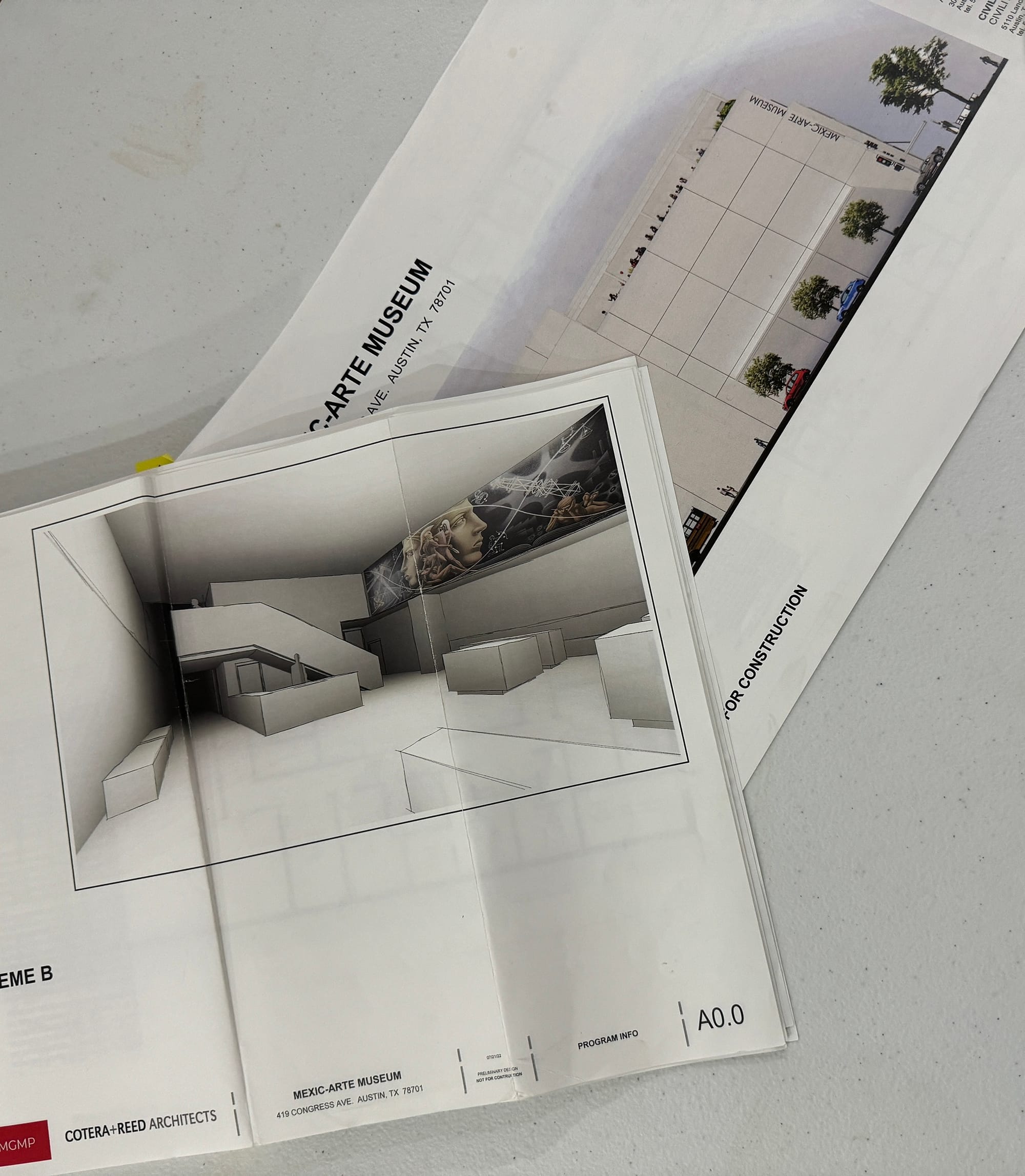 Building plans for the Mexic-Arte Museum renovation, expected to be completed by 2027 or 2028, which Orozco showed me during an interview at the museum in January (photo Jessica Fuentes/Hyperallergic)