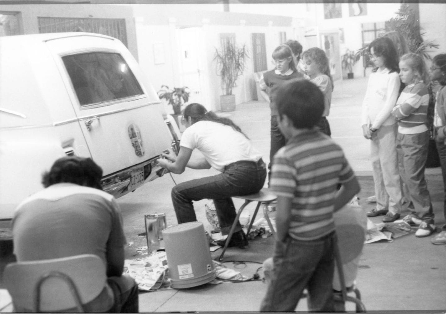 Pio Pulido, a co-founder of Mexic-Arte, painting a lowrider hearse for the Día de los Muertos Celebration in 1984 (photo courtesy Mexic-Arte Museum and the University of North Texas Libraries, The Portal to Texas History)