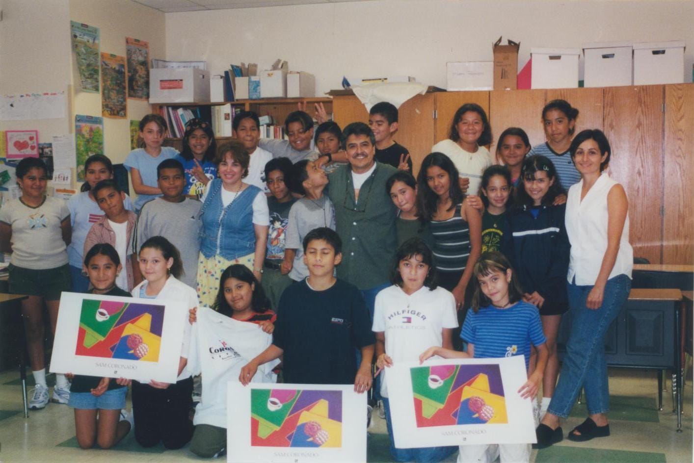 Sam Coronado posing with students in 1988 (photo courtesy Mexic-Arte Museum and University of North Texas Libraries, The Portal to Texas History)