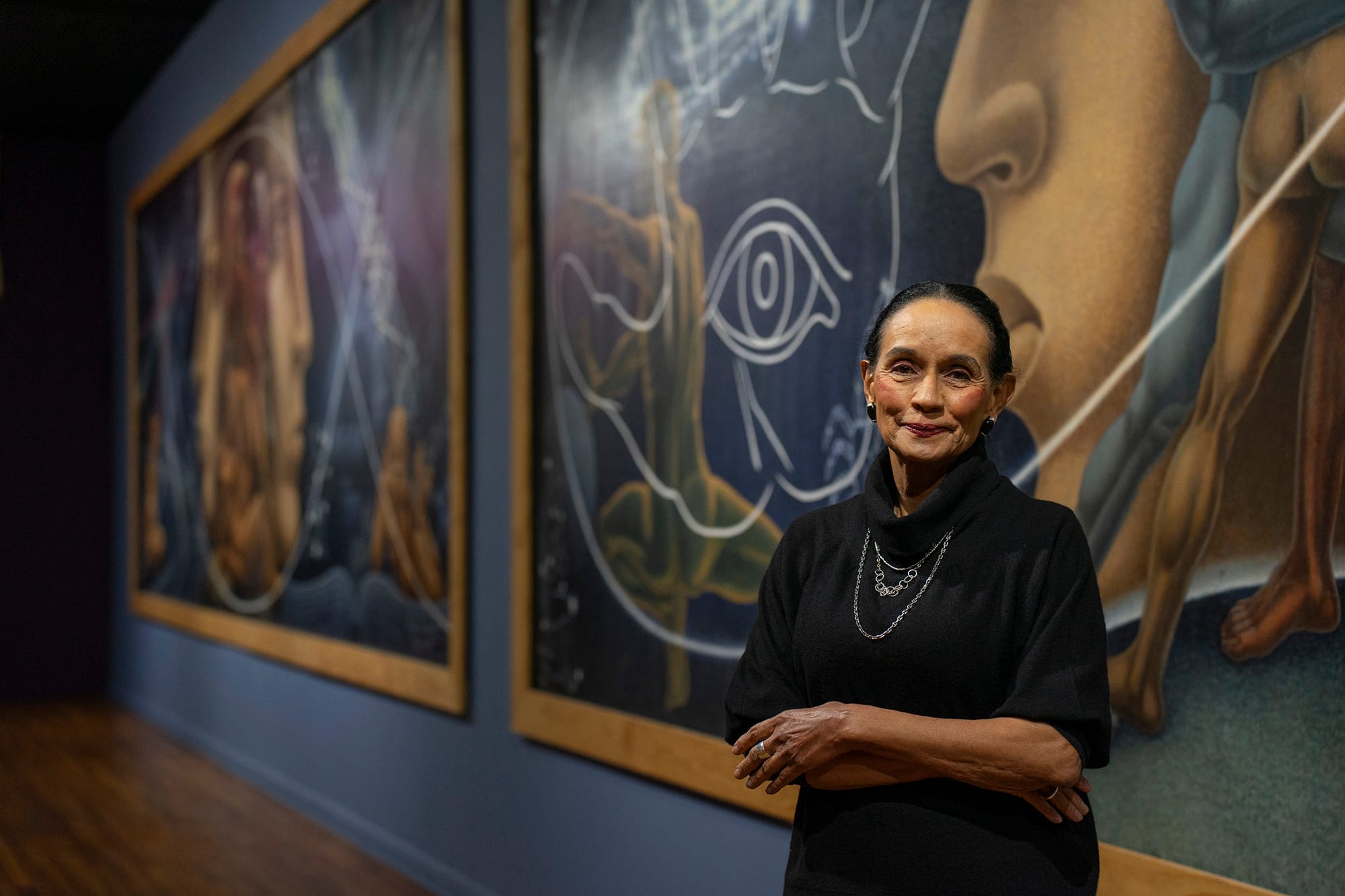 Sylvia Orozco standing in front of a large-scale mural inside the Mexic-Arte Museum in2024 (photo by and courtesy Raul Rodriguez)