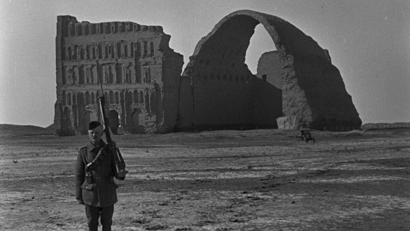 Shot on 16mm film, these directed scenes fit seamlessly between archival footage, sourced by Krayenbühl and Oelbaum, that tracks the Middle Eastern landscape from the late 1890s through the mid-1920s. Watching the film feels almost like sifting through an archive yourself: The old footage, still photographs, and newspaper clippings are refreshingly displayed without contemporary commentary; the filmmakers have left that to us.