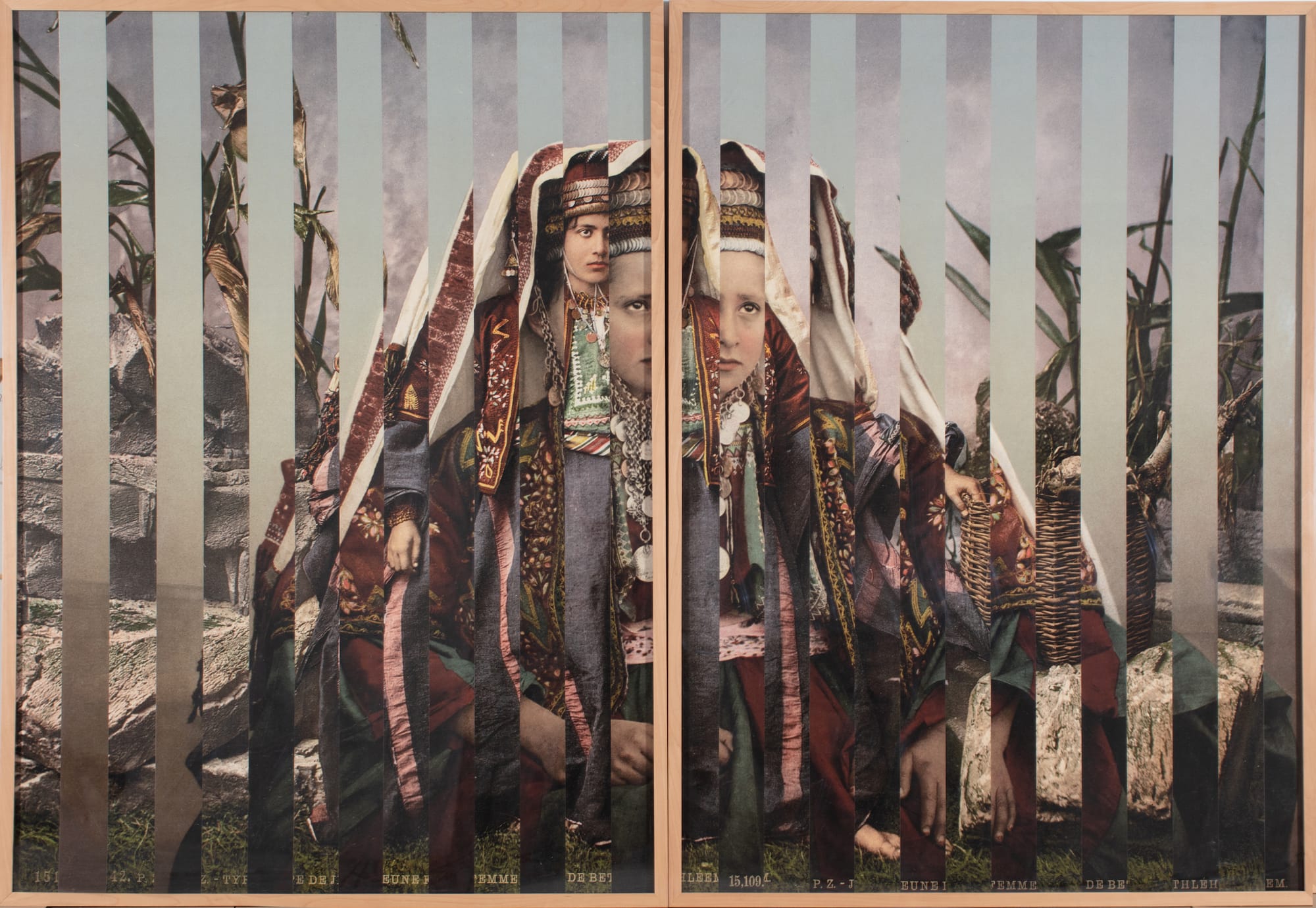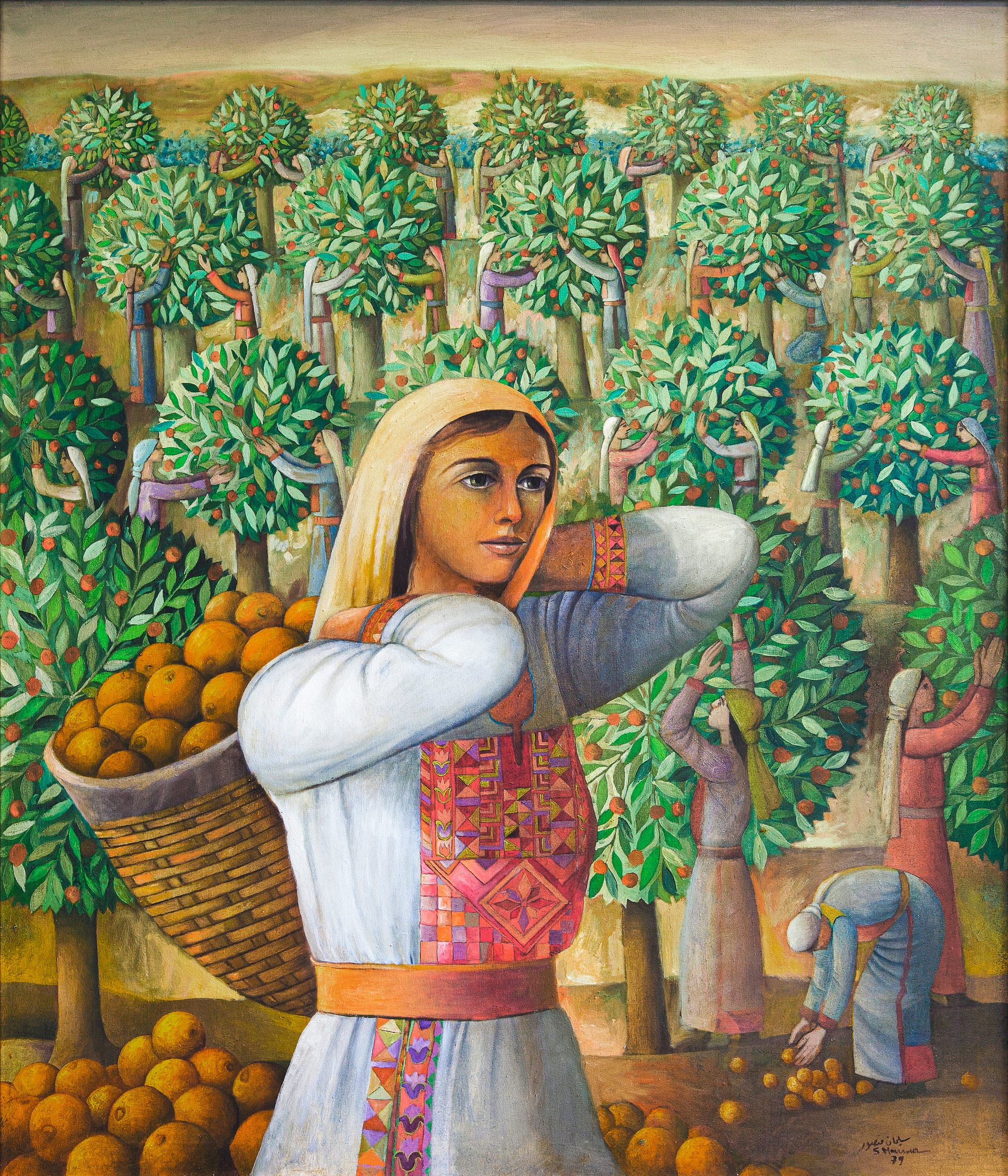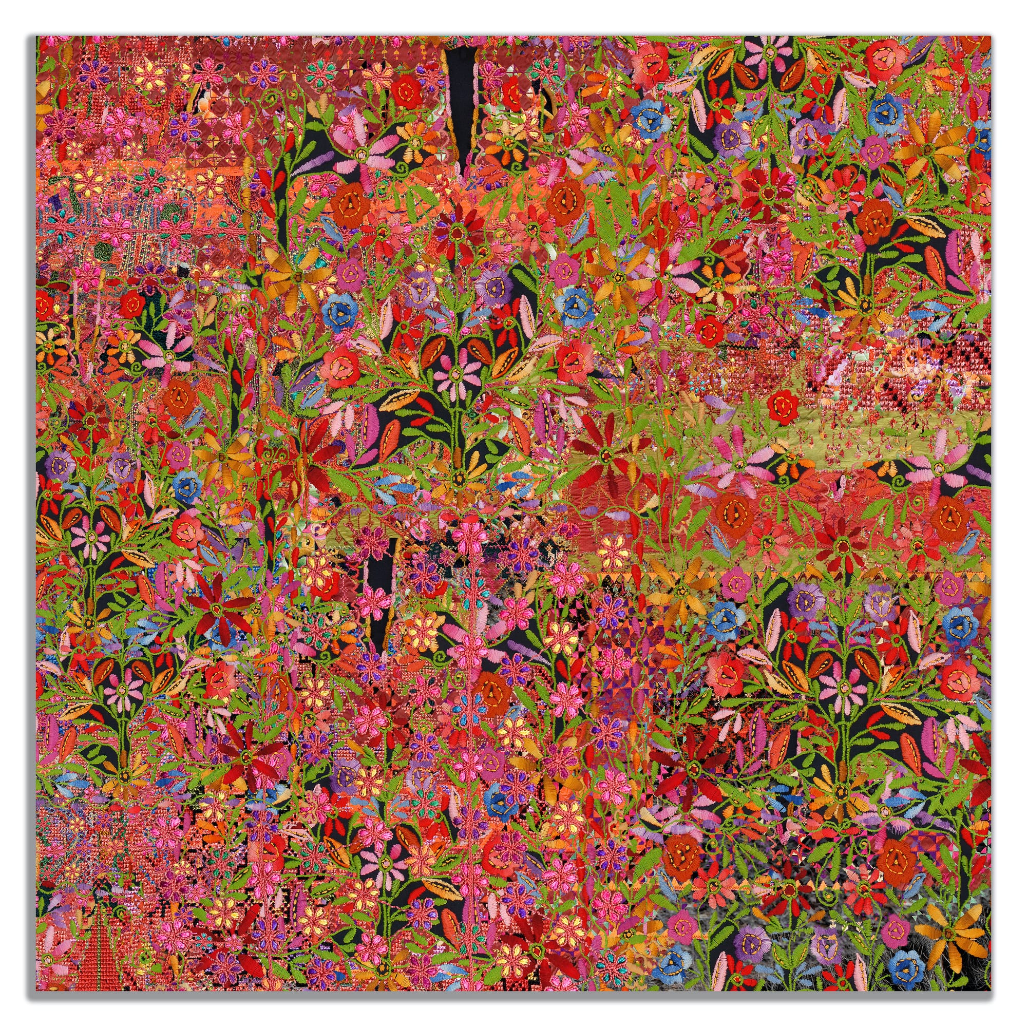 The images include portraits of women under olive trees or in orange fields in Jaffa by Sliman Mansour, who co-founded the League of Palestinian Artists; collages of Gaza landscapes from Hazem Harb; manipulated archival photos from Sary Zananiri that question “how archaeological or ethnographic knowledge is generated”; the kaleidoscopic floral prints of Steve Sabella; and the colossal embroidery installations of Samar Hejazi, whose work is shown on the book’s cover.