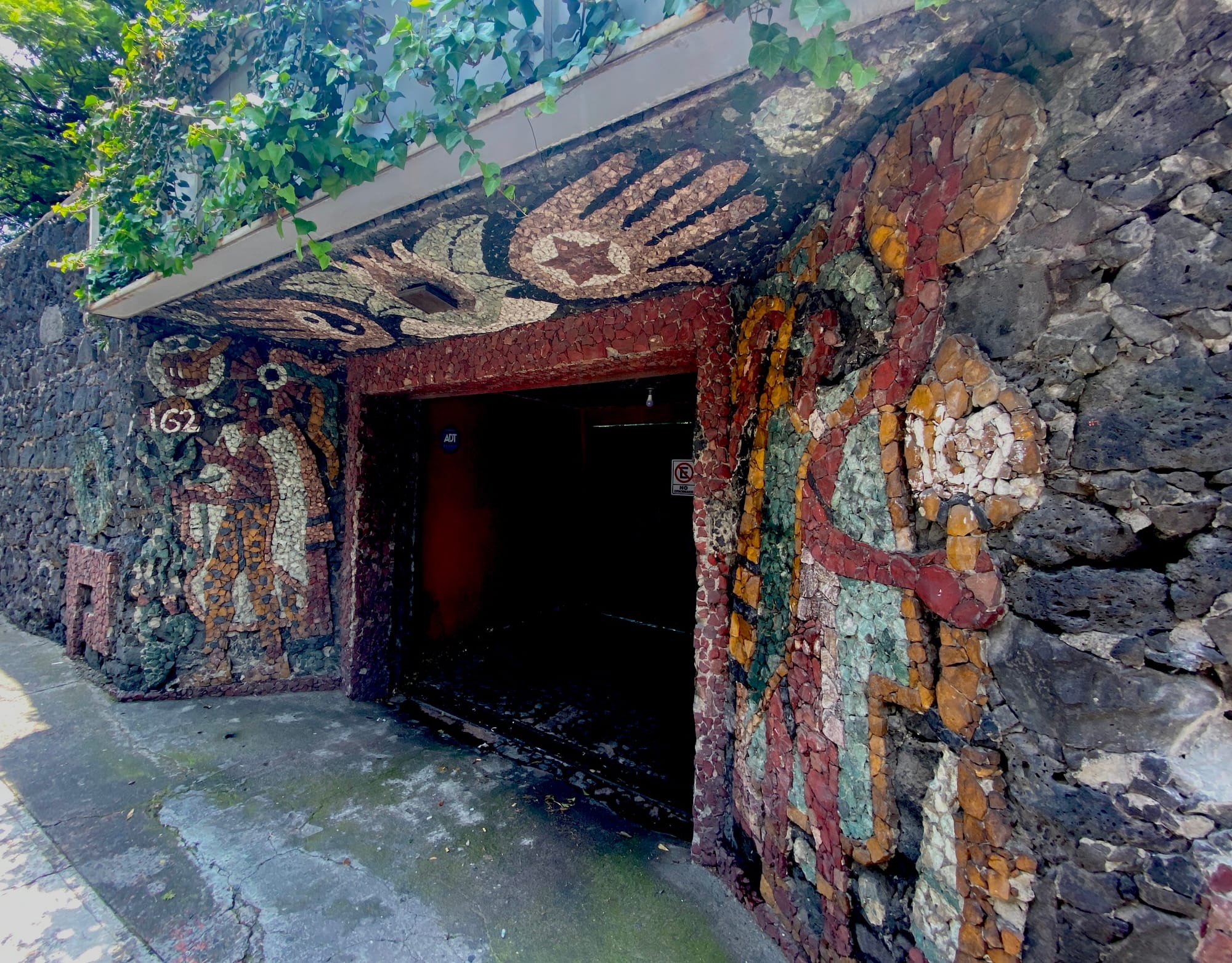 Still, O'Gorman maintained that Escobedo reneged on a promise, an accusation all the more damning because of what the house symbolized. For O'Gorman, whose buildings had long respected the utilitarian, modular, and stripped-down philosophy of Functionalism, Casa Cueva — his last architectural project, which he designed without blueprints by tracing the natural curves of the lava cave — marked his definitive passage to Organic architecture. With its colored stone mosaics of Indigenous motifs embedded in the basaltic flows left by the eruption of the Xitle voclano over 1,600 years ago, Casa Cueva embraced regionalism and storytelling, an approach starkly different from that of the abstract, monumental sculpture artists like Escobedo were beginning to pursue at the time. O'Gorman's visual language was specific, local, legible to the Mexican community; Escobedo's was broad, sweeping, and universal.