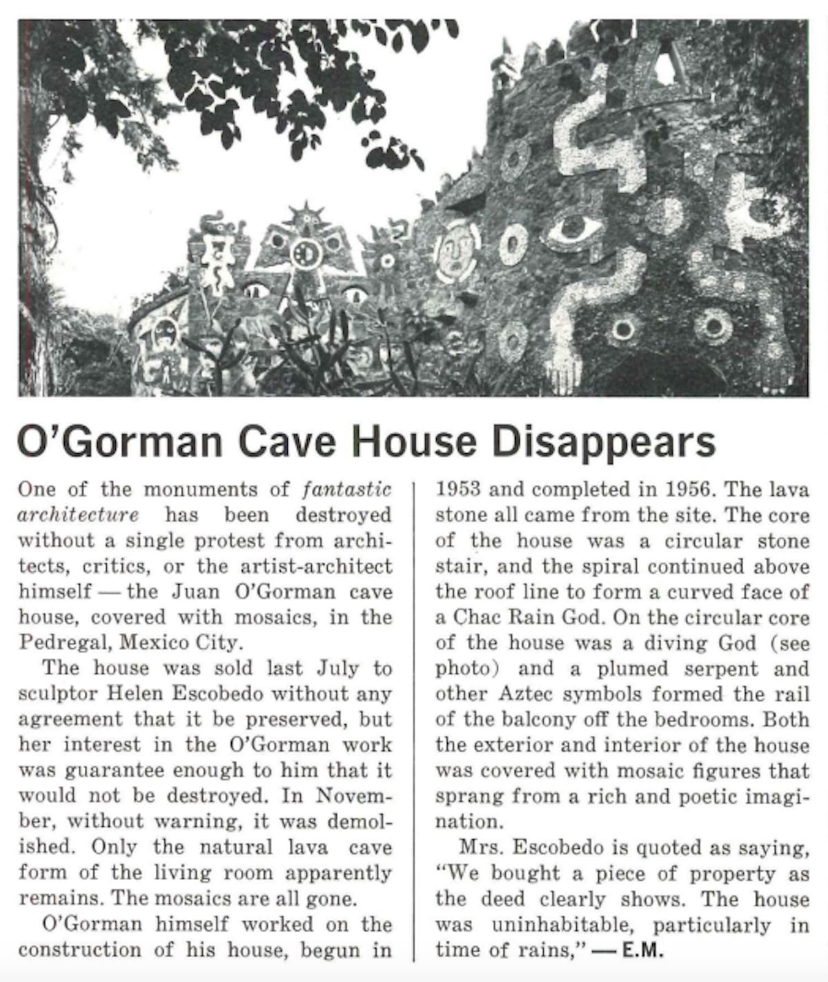 In recent years, noble attempts to preserve the memory of O'Gorman's cave house have also dredged up the controversy around its disappearance. O'Gorman sold the property to Escobedo in 1969 on the basis — according to his account — of her verbal promise to preserve it. She proceeded to demolish parts of the house and transform others beyond recognition, with little resistance from the cultural community. Only art historian Ida Prampolini, the wife of artist Mathias Goeritz, was vocal about her criticism, publishing a scathing essay in protest. "Aren't museum directors in charge of preserving art?" she wrote of Escobedo, who was then at the helm of the Museo Universitario de Ciencias y Arte. "If it's true that Mrs. Escobedo wants to construct her own 'sculptural house,' couldn't she buy a different plot of land, or a house that is not of artistic value?"