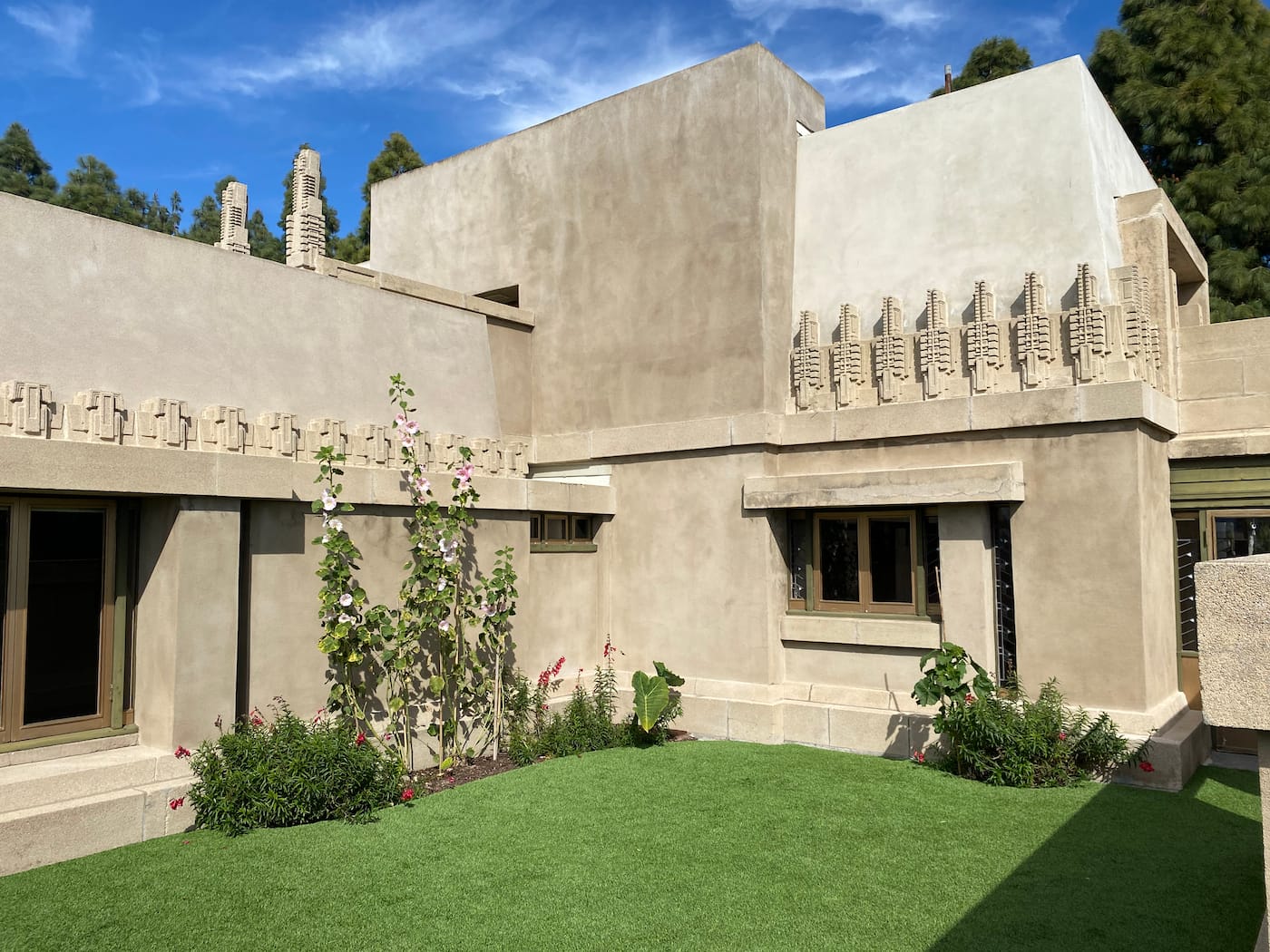 Completed in 1921, the Hollyhock House was commissioned by Aline Barnsdall, an experimental theater producer, committed feminist, and heiress to an oil fortune who envisioned it as part of a 36-acre arts complex perched on a hilltop on the border of East Hollywood and Los Feliz. Her relationship with Wright, the architect she hired for the job, was antagonistic and combative, and he was ultimately fired from the project, replaced by his assistant Rudolph Schindler, who would go on to become a seminal figure of Southern California Modernist architecture. Barnsdall only lived in the house for a brief period before donating it to the city in 1927.