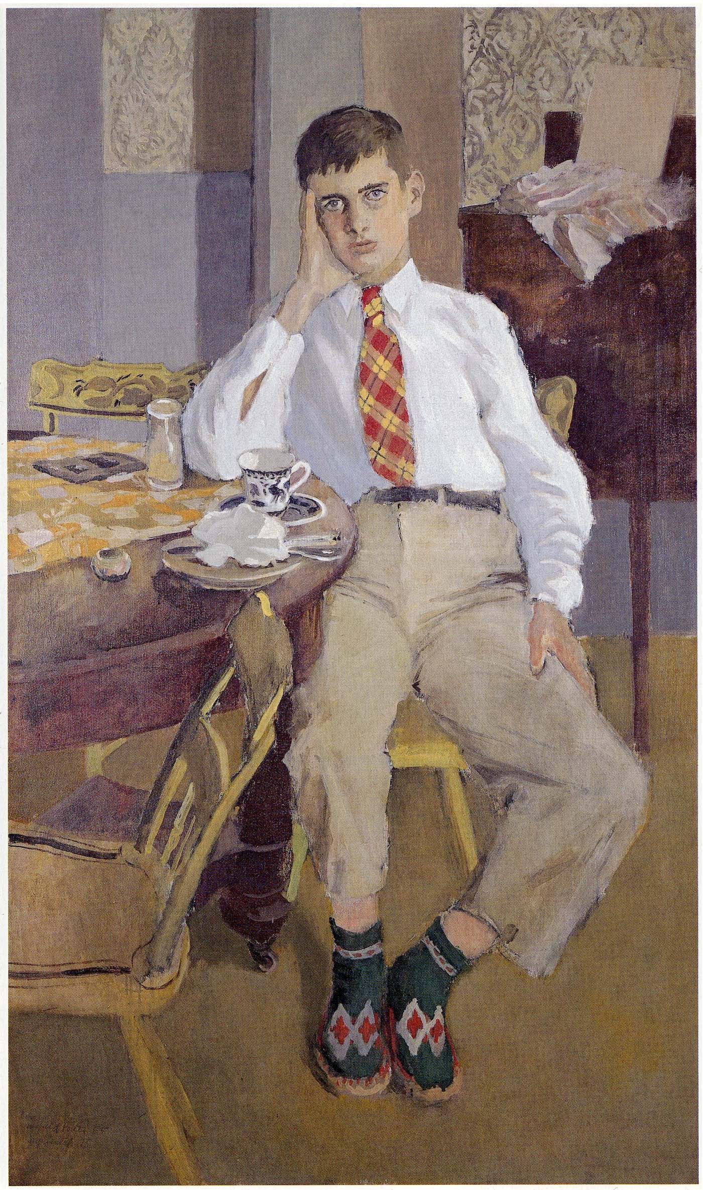 The sitter is in his late teens. Yet it appears to be a portrait of a young man as a somehow exhausted old man. He stares blankly forward, his lips almost pursed. His formal attire — red and green socks, pale khakis, white shirt, plaid tie — combined with his self-consciously “grown up” pose — right hand pressed to his head while his left hand cups his left leg — lend him the look of a corporate manager bored to death, as if he were listening to an oral report from the legal department.