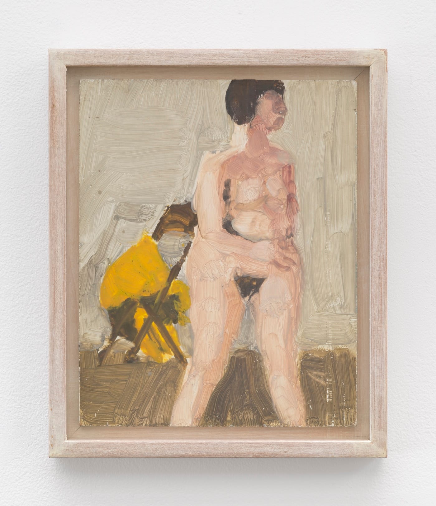 Within the re-creation of shadow and light, the painting’s surfaces — walls, doorway, floor — ricochet to life in grays, yellows, and browns. These colors shift and elide one another; some seem organized into bands of competing tones as they transect and bisect the portrait’s almost suffocating stillness.