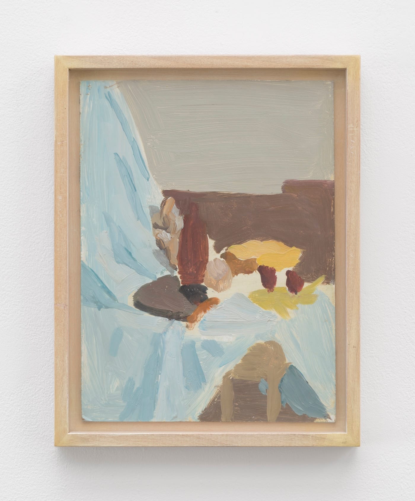 Most of the other works were completed while the artist taught at Amherst College in 1969-1970. Small oil paintings on boards and panels look at first glance radically abstract, at least by Porter’s usual standards. On closer inspection, those thick-painted blocks of color suggest realities seen from a foggy distance, or through blurred or just-waking eyes – a tree in a remote field, a nude after her bath, a bottle amid domestic objects randomly positioned on a dining room chair.