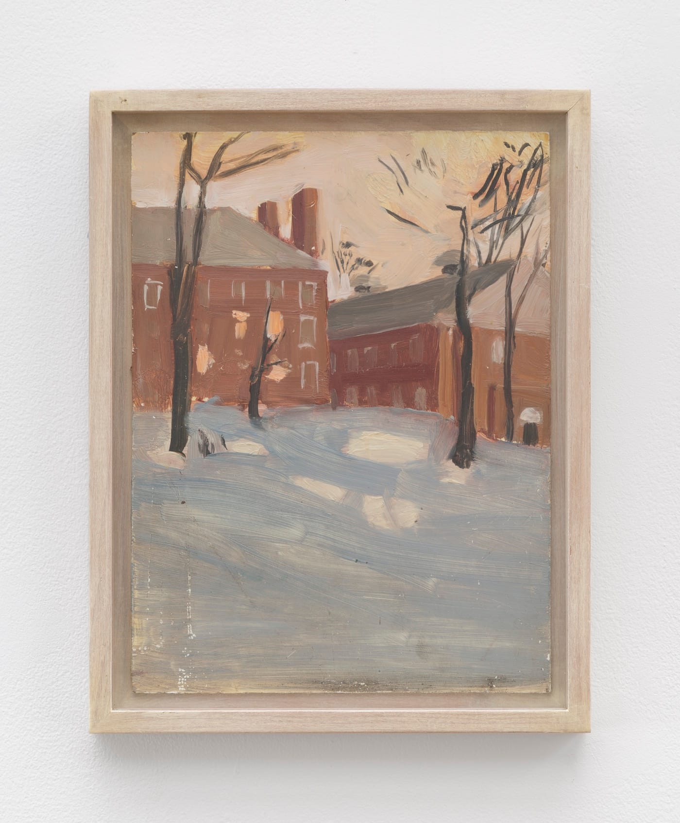 In the landscape paintings, a few depicting the grounds of the Amherst campus, such as “Untitled” [Amherst building in snow]” (1969-70), the artist’s trademark attention to changing casts of sunlight, including the radiant, reflective play of fresh snow and autumn colors, create placid harmonies despite deliberately slanted or skewed vantage points.