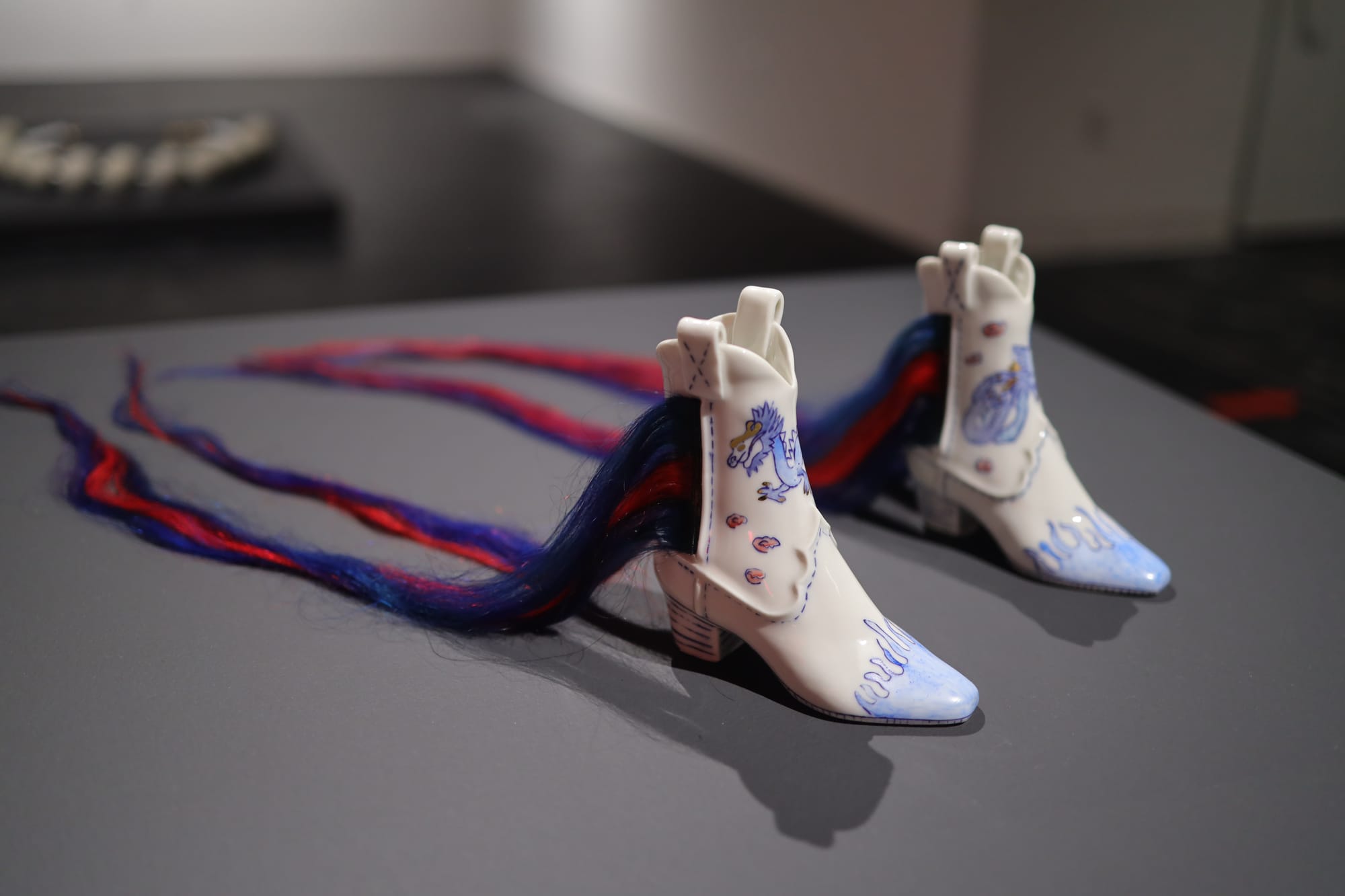 The exhibition space is filled with the haunting, rhythmic sounds of gently clattering porcelain. The video “Tame” (2021) shows the artist holding a basket of porcelain “China girl” figurines, her hair braided into the shape of a horse bridle. Each time that Datchuk’s hair is pulled by someone off screen, the figurines in her basket rattle. Soft as it may be, the sound takes on the urgency of a ticking time bomb as the delicate porcelain figures threaten to finally shatter, and as the artist’s neck and head jerk backwards time and time again. Hair-pulling is something that many young girls have experienced, and in adulthood, it has connotations of sexual dominance. But it also refers to the larger forces that try to ‘tame’ us, ‘break’ us, or hold us back.