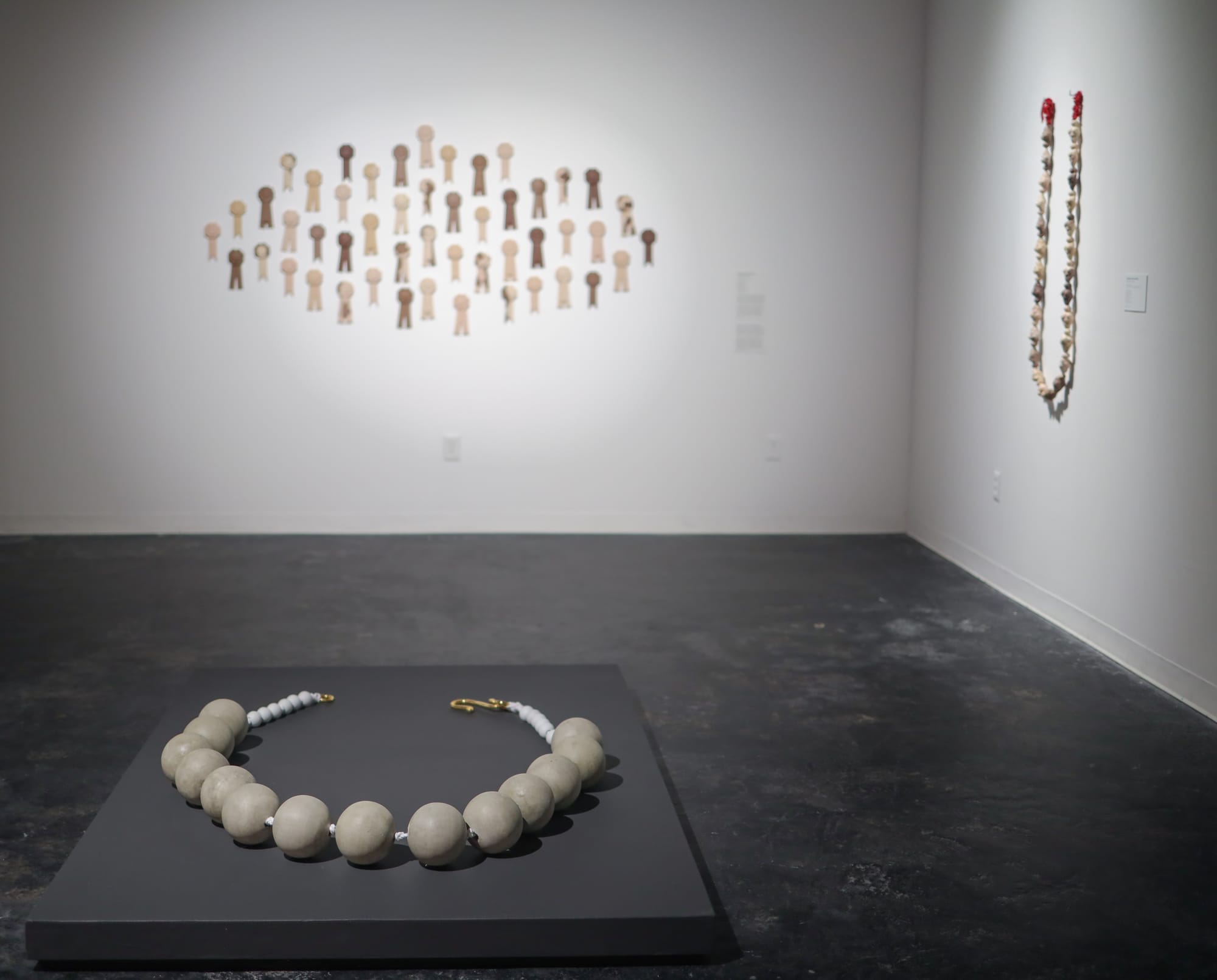 Another oversized necklace lays on a low plinth nearby. “Heavy” (2021) resembles an enormous string of pearls, but its softball-sized cement beads and rope also remind us of bondage. “We are taught as women that we have choices and opportunities,” Datchuk said, “but have so many societal, cultural, and political systems that continue to hold us back.” Whoever might attempt to wear this piece would likely be unable to move. The fact that a simple act of adornment could be crippling reminds us of the many times that women are blamed for their marginalization, abuse, and even murders because of what they wear.