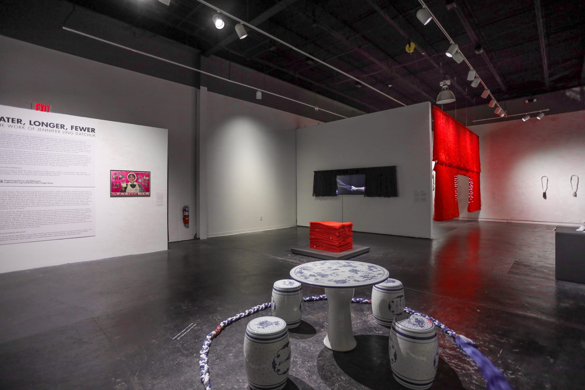 Later, Longer, Fewer: The Work of Jennifer Ling Datchuk at the Houston Center for Contemporary Craft takes its title from the propaganda poster, but also takes up its apparent aim to empower women through their own bodies. In the exhibition, Datchuk’s thoughtful multimedia sculptures, large-scale installations, and performance videos operate in the tense spaces between high and low decorative arts, found and made objects, and Asian and Western histories. Created between 2012 and 2021 — with the majority being made this year — the artist’s works move nimbly through a variety of everyday materials including rope, clay, cement, and human and synthetic hair. Datchuk’s intelligent and approachable perspective is especially resonant in our political and social moment, which continues its fraught fixation on controlling women’s bodies.