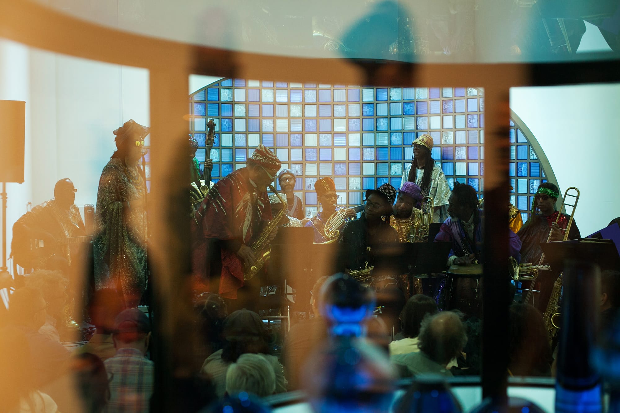 The third performance in the series was by the legendary, intergalactic Sun Ra Arkestra, with the band members, attired in their spectacular Egyptian/science fiction/spiritual seer clothes, playing in front of “Moon Mirror.” The soulful, exuberant, transcendent, space- and time-traveling jazz of the Arkestra perfectly meshed with McElheny’s artworks, with his section-of-sky sculpture and lunar-phase paintings, his blue-vessel observatories and telescopic abstractions. Twice, members of the band left their positions to parade through the packed audience and the exhibition, while playing their instruments, singing, chanting, lifting their gazes up, and pointing fingers toward the ceiling, and beyond that, toward the sky and universe. Explorative music and art fused into a transformative communal experience. The performance was inviting and cathartic. So too is McElheny’s art.