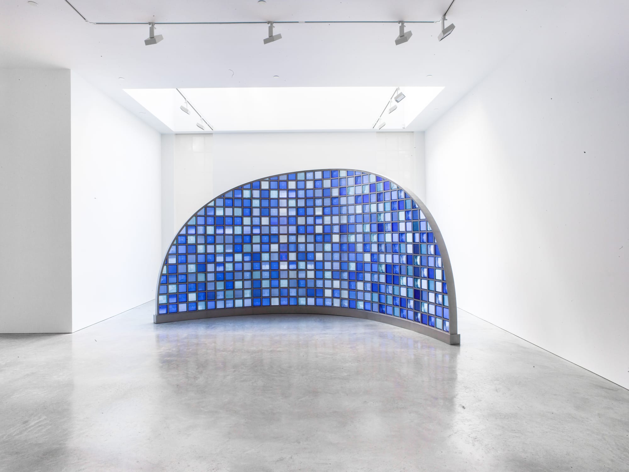The centerpiece in this room — which also serves as the acoustic backdrop for musical and spoken word performances — is “Moon Mirror,” a large (at 103 by 191 1/2 by 71 inches), crescent-shaped sculpture made of prismatic glass tiles, in varying shades of blue, set into a steel armature. The glass tiles juxtapose different designs: concentric circles, horizontal lines in a stack, vertical ones in a row. The crescent shape alludes to the moon while the curved structure suggests a sweeping view of the sky.