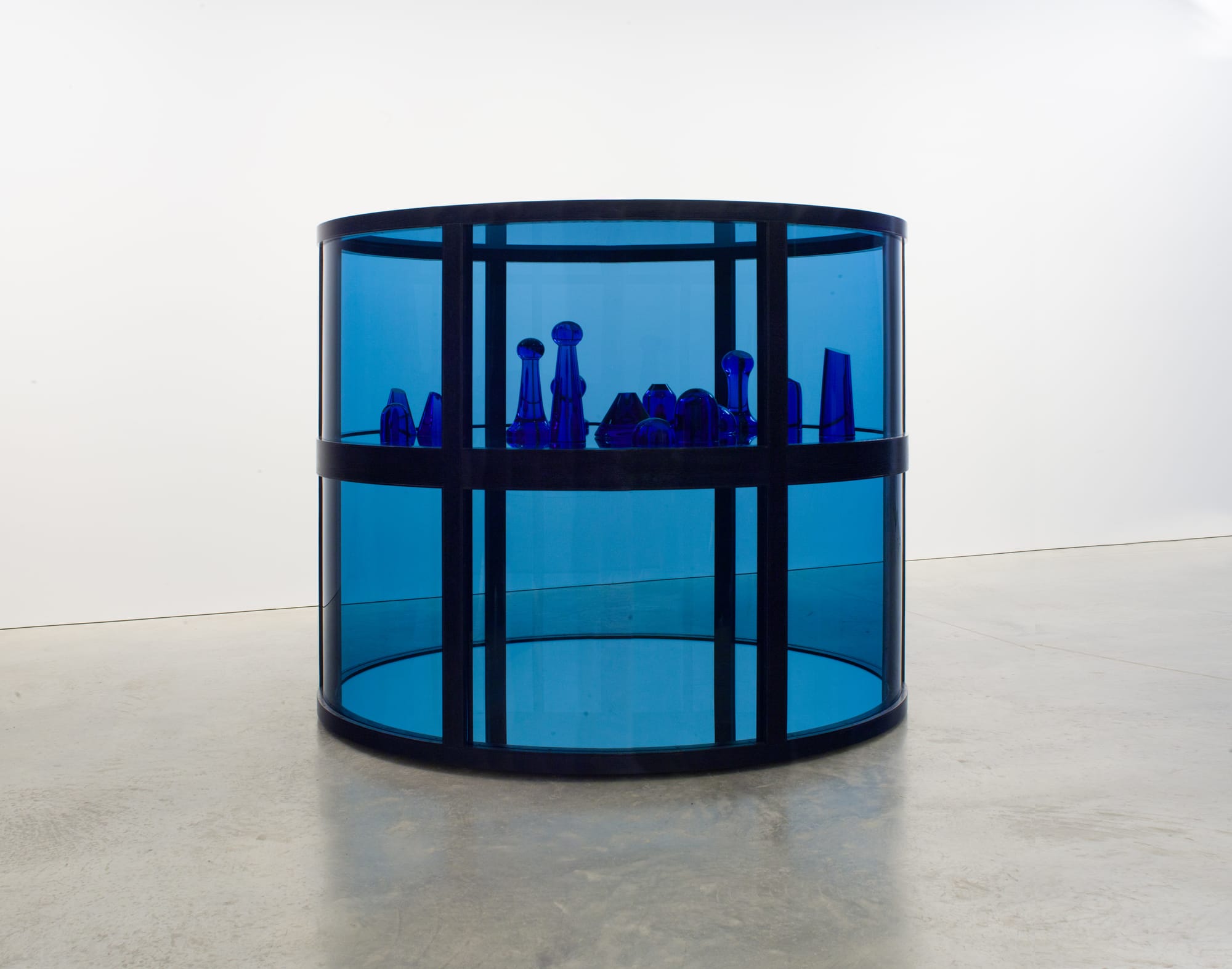 It looks like an eccentric display case, a minimalist sculpture, a bit like a large telescope pointing up, and an oddly geometric section of the late twilight sky — the ethereal and boundless concentrated into the finite and physical. Inside the semitransparent blue case, on a mirrored shelf, are darker blue bottles and other vessels of different sizes and shapes. These objects were not intended to be functional. They have a quiet grandeur.