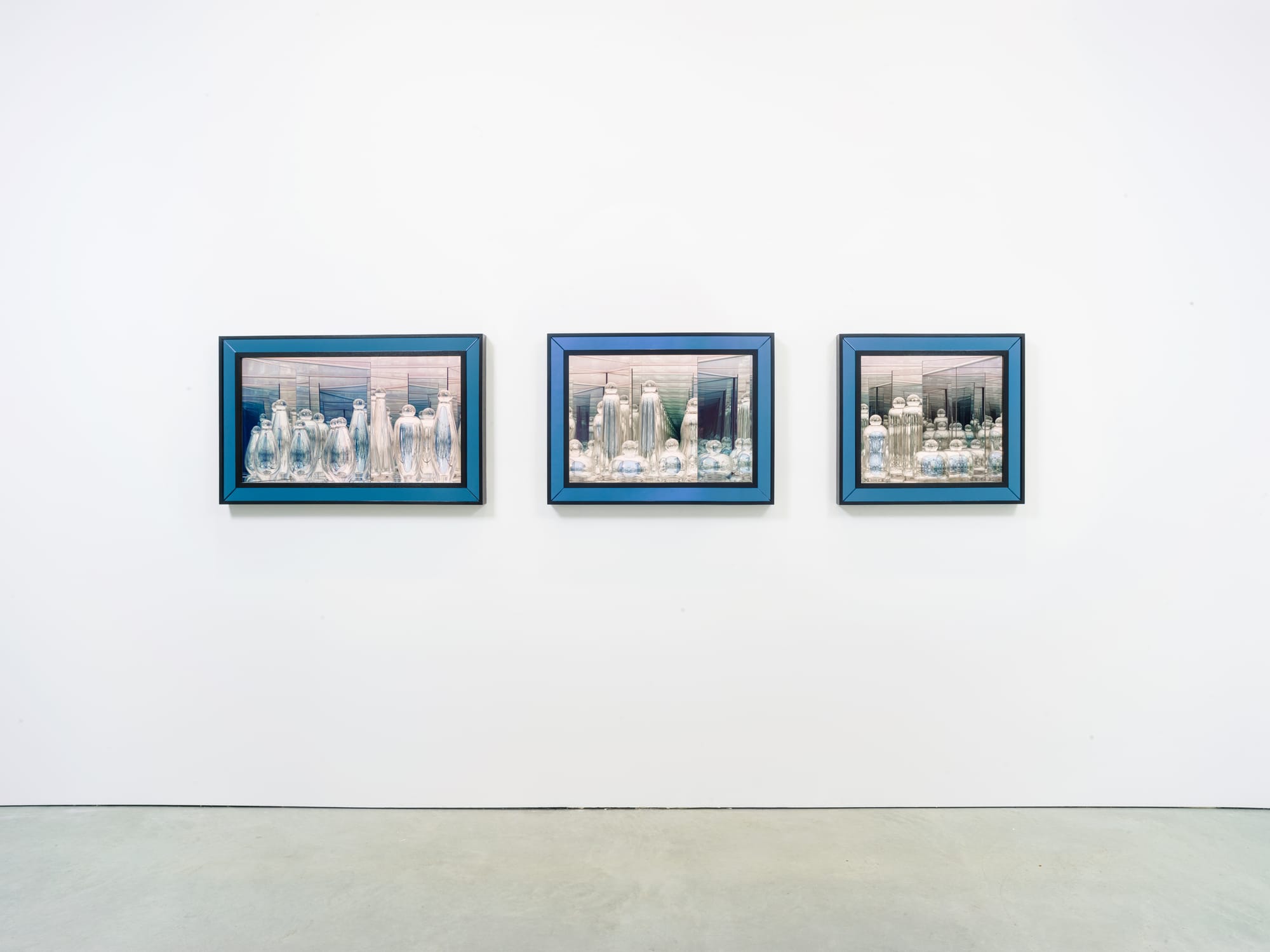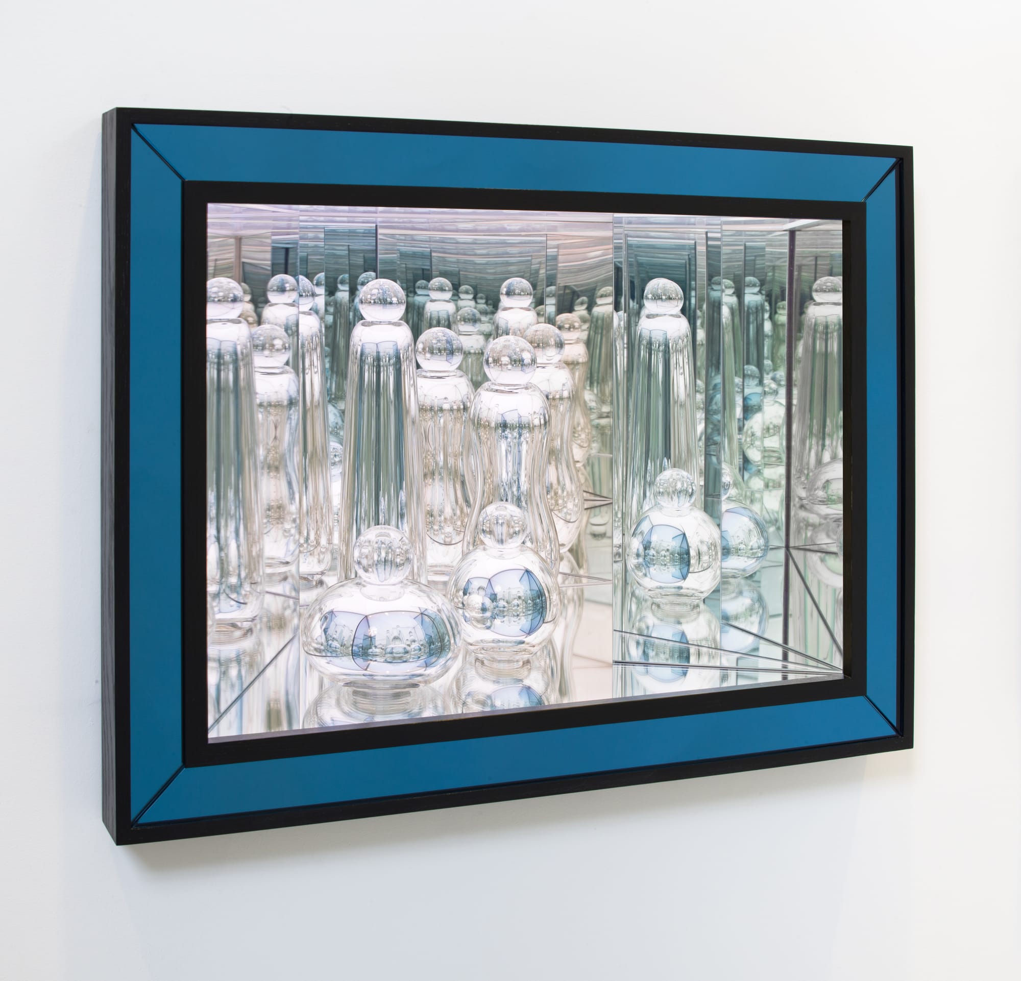 There is a great deal of poetry in McElheny’s show. “Three Twilight Labyrinths,” the first work one encounters, is a conflation of sculpture and still life painting. Three illuminated, mirrored cases are installed like paintings, but are actually displays that go into the wall, forming what McElheny calls “architectural interventions.” They contain silvery, mercury-like stoppered glass bottles. The bottles are highly reflective and resplendent, and they are further reflected by labyrinthine mirrors in the cases. The tripartite work has a twilight shimmer, suggesting the clarity of daylight just shading into dusk, while their blue-and-black frames signal night coming on. In this in-between time visual magic happens and the echoing vessels are breathtaking.