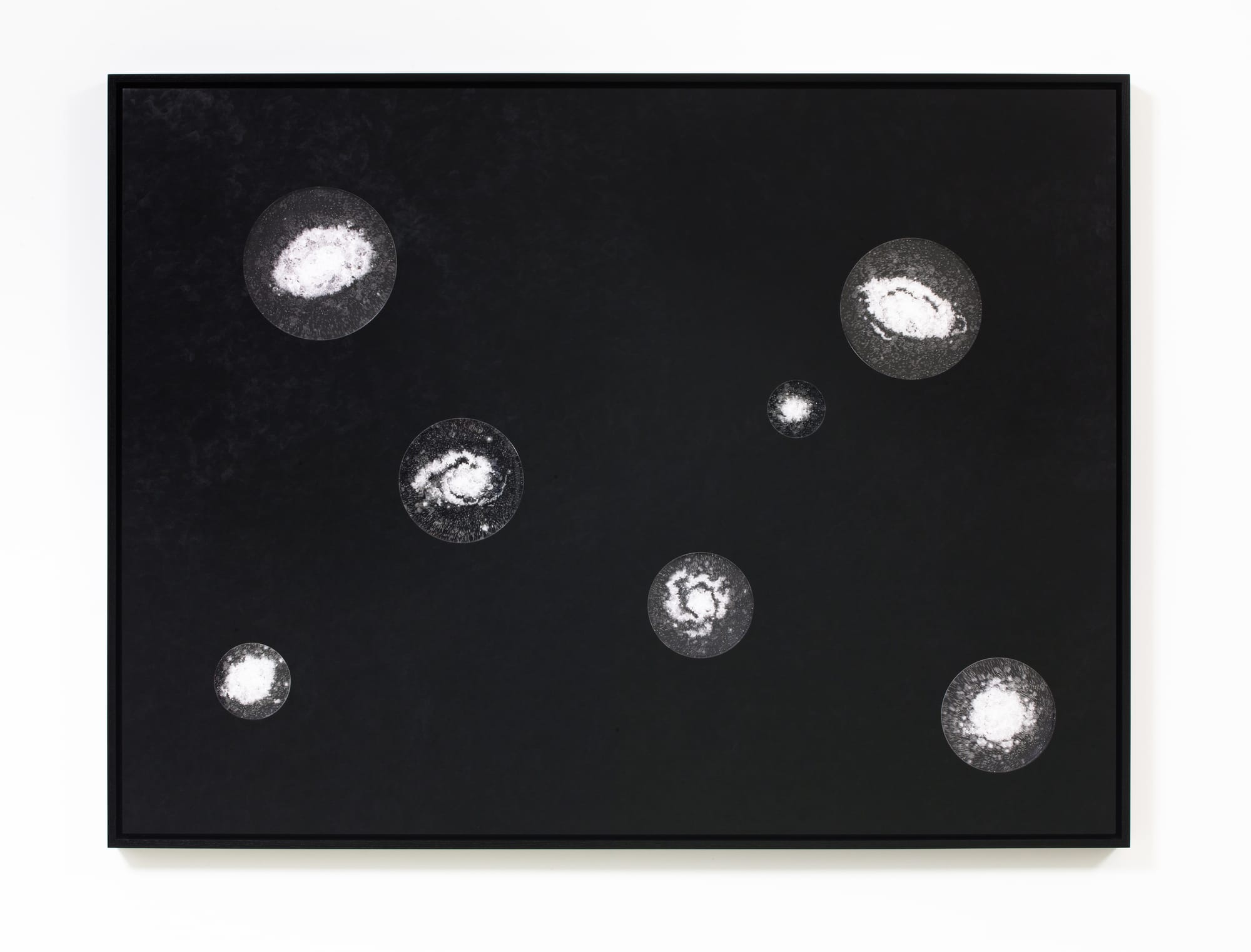 Look from straight on and the imagery seems painted and flat. Move slightly to the side and you see the three-dimensionality and bristling materiality of the miniscule glass pieces. While basically abstract, these observation circles reference the 18th- and 19th-century drawings of nebulae made by British astronomers William and Caroline Herschel, among many others. McElheny’s paintings also suggest telescopic views of whopping cosmic bodies far out in space, which elude the naked eye: spiral galaxies, galaxy clusters, stars, a multitude of worlds beyond our own.