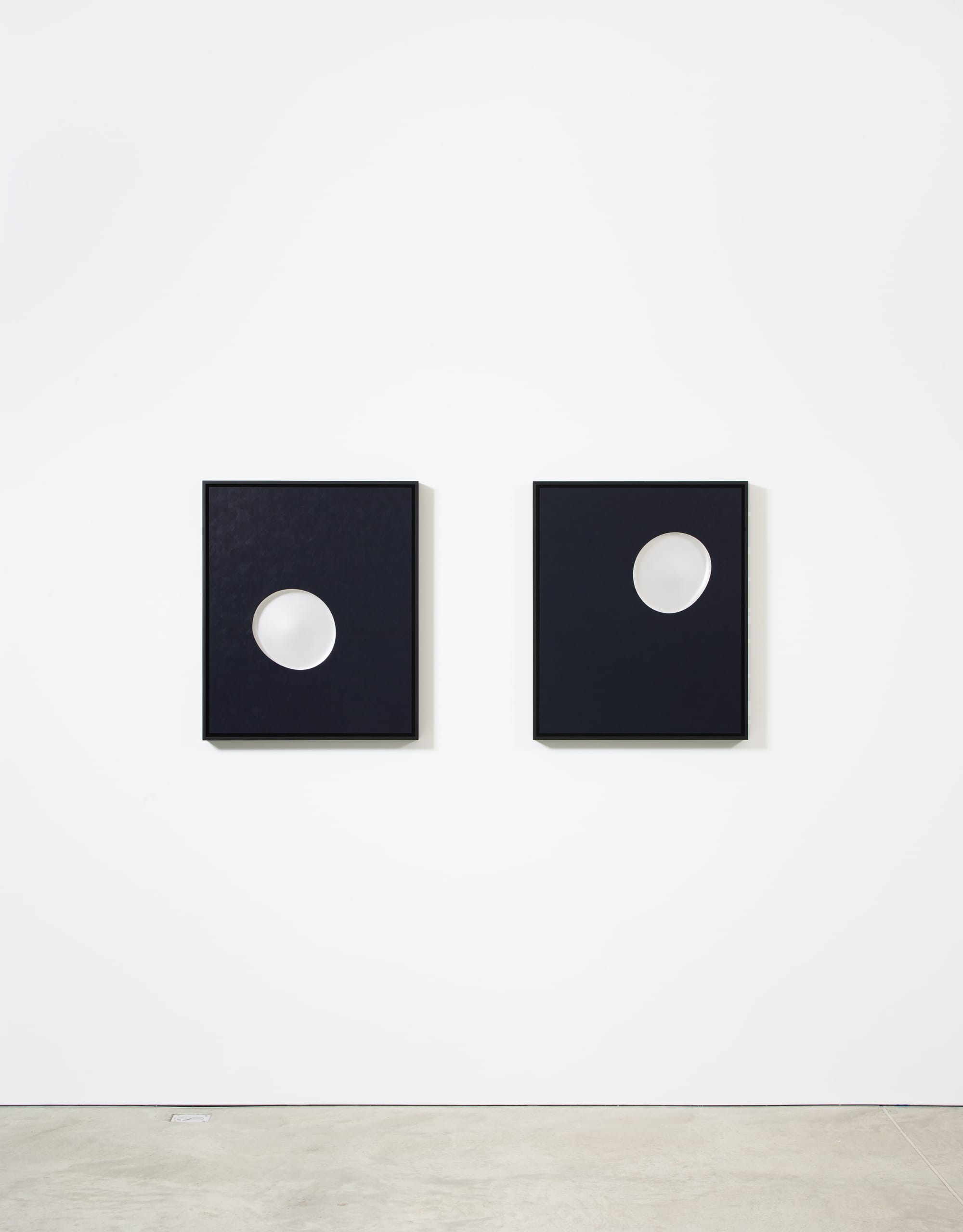 Across the room are two elemental, mesmerizing abstract paintings, “Lunar Waxing” and “Lunar Waning,” which evoke the allure, through the ages, of the moon with its phases. Their dark blue, almost black, painted surfaces are like abstractions of the night. Both paintings feature a very large, smooth inset made of different components of polished and ground glass and a low-iron mirror. Their shapes — not exactly circular — have some kinship with the off-kilter quasi-circles in Jean Arp’s sculptures, paintings, and woodcuts; they also obliquely suggest gibbous moons. From a distance these glass insets seem like holes in the painting, revealing the white wall behind them. Up close they at once admit and reflect light. Opaque and glowing, they are remarkable, and they exert an almost magnetic pull on one’s sight and psyche.