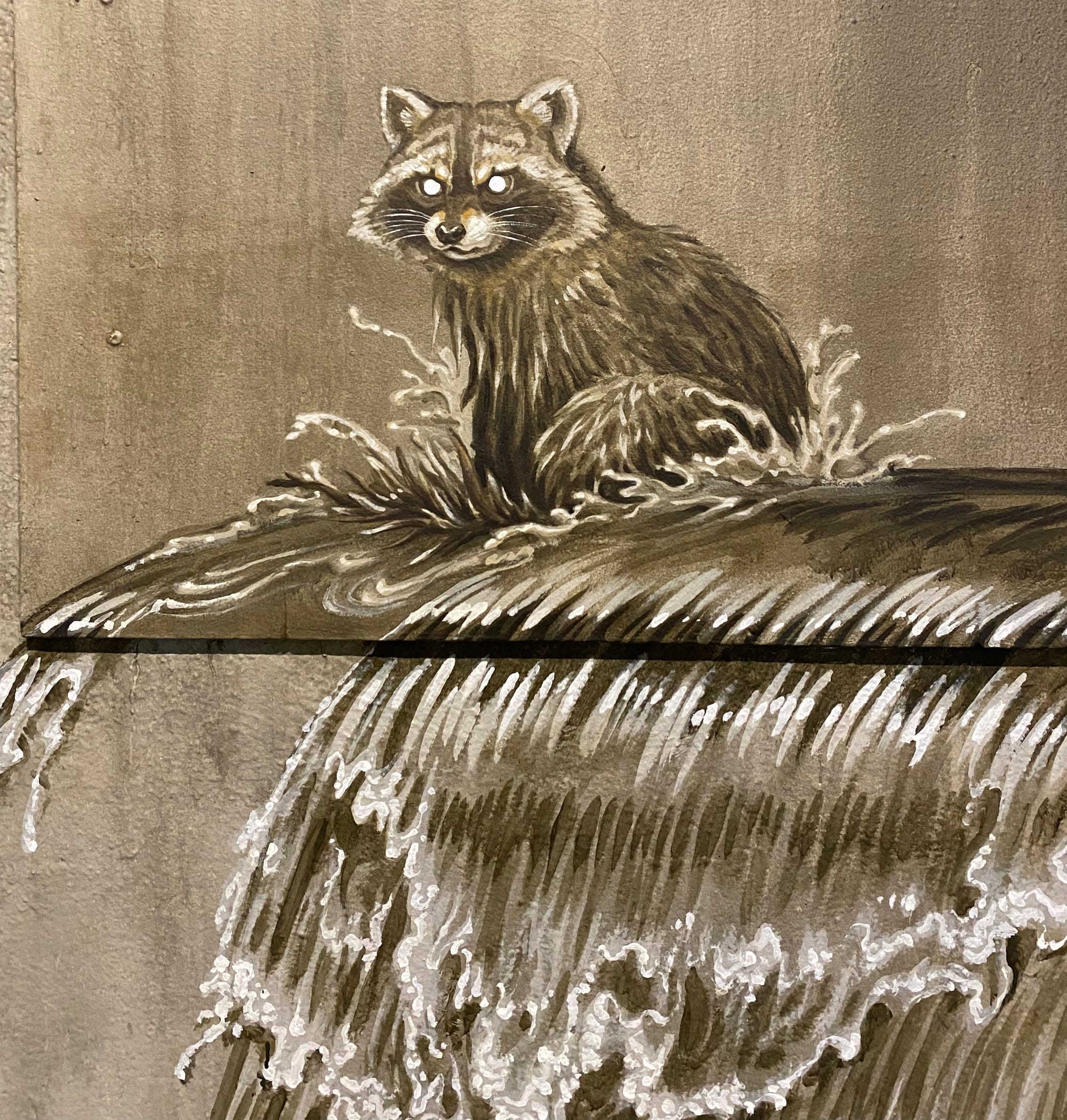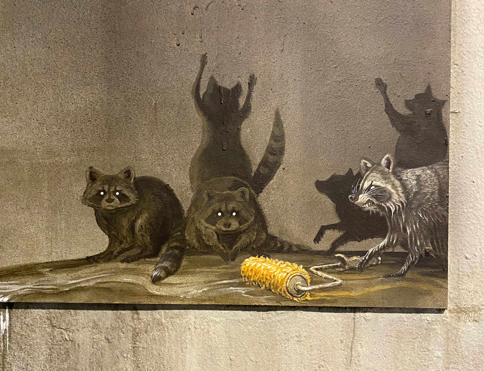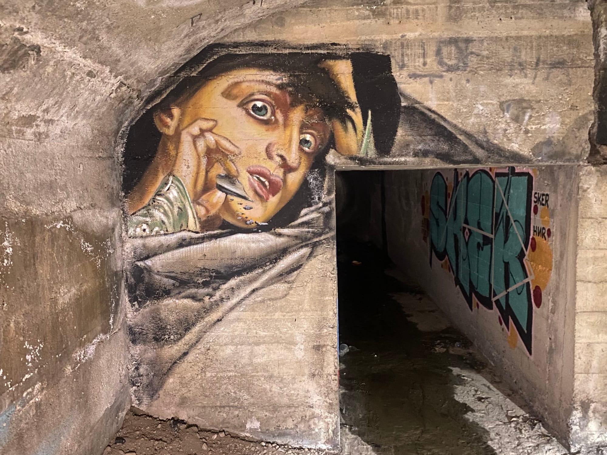 Half an hour later, the tunnel opened up into a small chamber containing two works by OU: Skrederstu’s trompe l'oeil painting of a wild-eyed woman appearing to break through the concrete wall and a portrait of a Mexican hairless Xoloitzcuintli dog by Tank One. We ventured further, crouching down as the tunnel got smaller, until Skrederstu stopped abruptly. In the distance, gleaming eyes stared back: a family of raccoons. “I’m not trying to mess with that,” he said, retreating and returning to the outside world just as most people were getting ready to start their day.