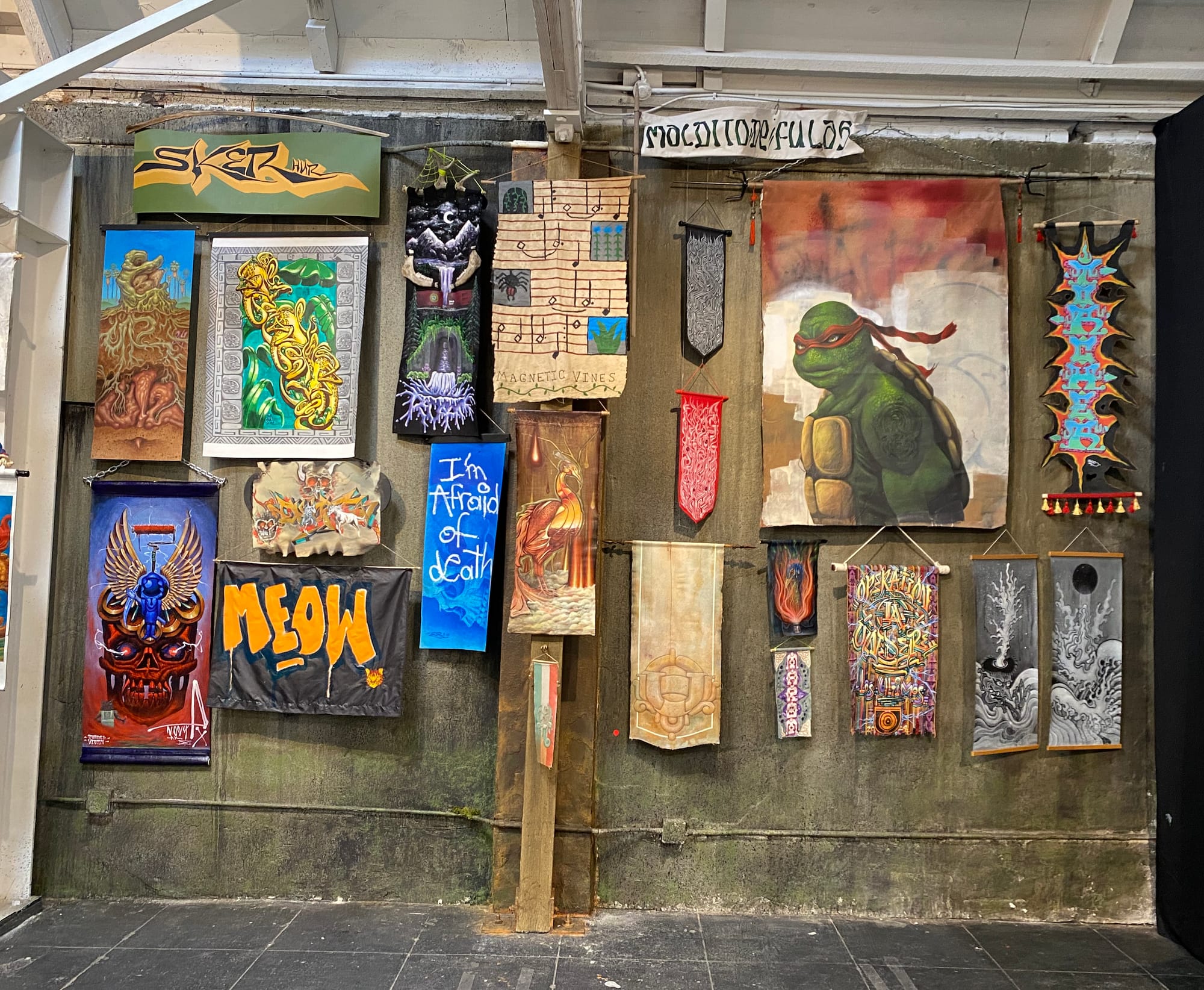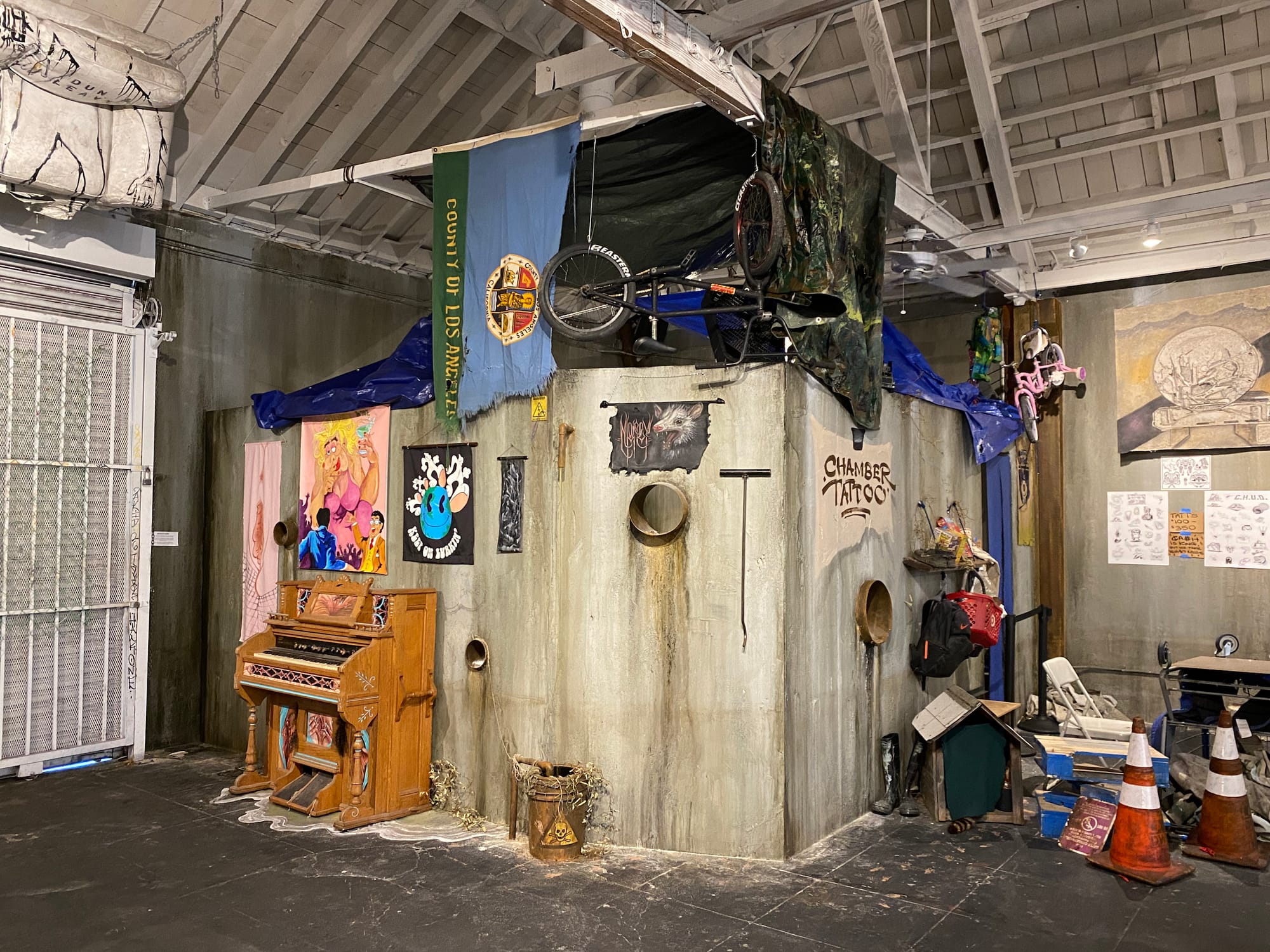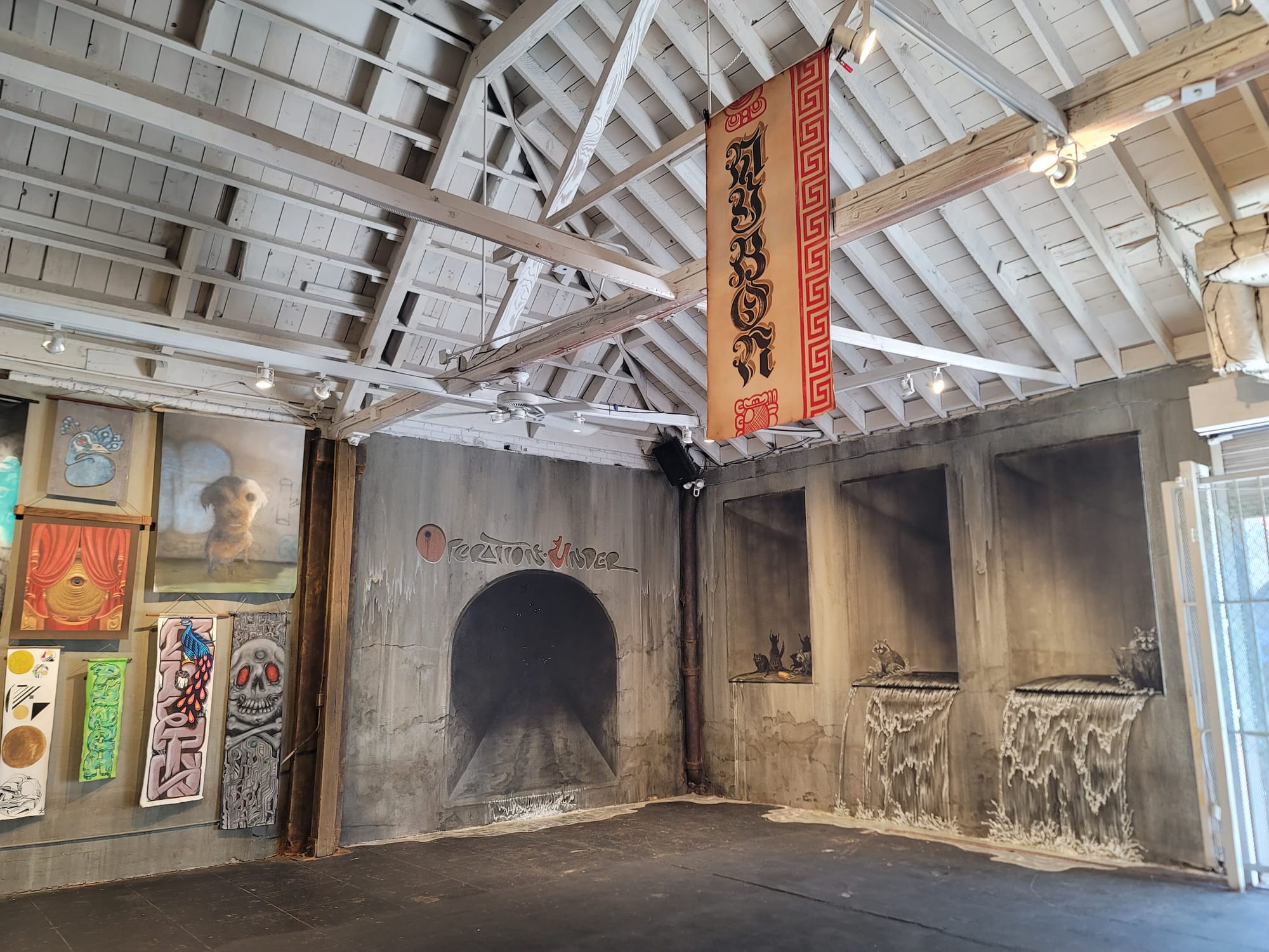 The tunnel was one of over 100 that Operation Under has explored and created art in over the past seven years. Now, the exhibition Life Underground at Superchief Gallery just south of Downtown LA brings the group’s mysterious workings to the surface, featuring original artwork by dozens of OU participants alongside photo and video documentation of their exploits. The walls are covered salon-style in painted banners, a recurring motif in their work that conjures a sense of old-world exploration, akin to planting a flag, and the back of the gallery has been turned into a kind of stage-set of a tunnel, complete with a family of curious raccoons, one of whom wields a paint roller. A makeshift tattoo studio behind a faux concrete wall occupies one corner, as illusionistically painted green water trickles from a fabricated pipe. This Saturday, August 24, Superchief will host a panel discussion with Skrederstu; author Susan Phillips; LA graffiti legend Chaz Bojorquez; and other scholars from the worlds of street art, ecology, biology, and beyond.