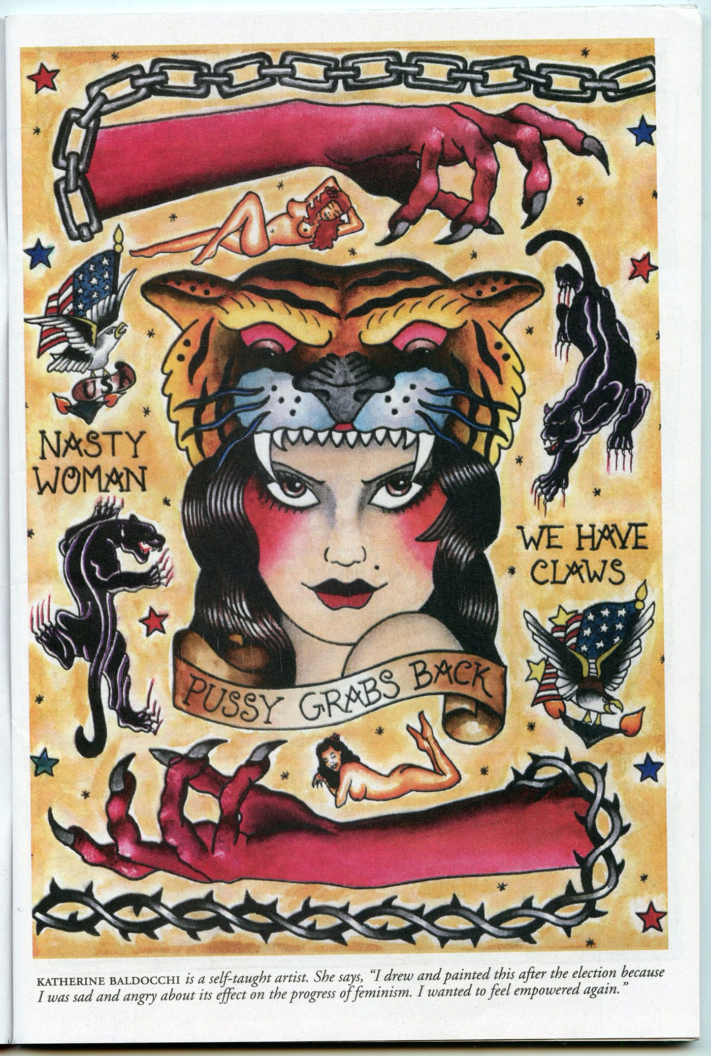 NS: It’s exciting also to watch it take shape. The second issue surprised us in how it began to develop a language and a style. We could look at things and say, “Oh, that’s very RESIST!” At the same time, we were also reacting to what we were being sent. The submissions were a lot angrier. The first issue had a lot of women linking arms, and the second issue had women making fists.