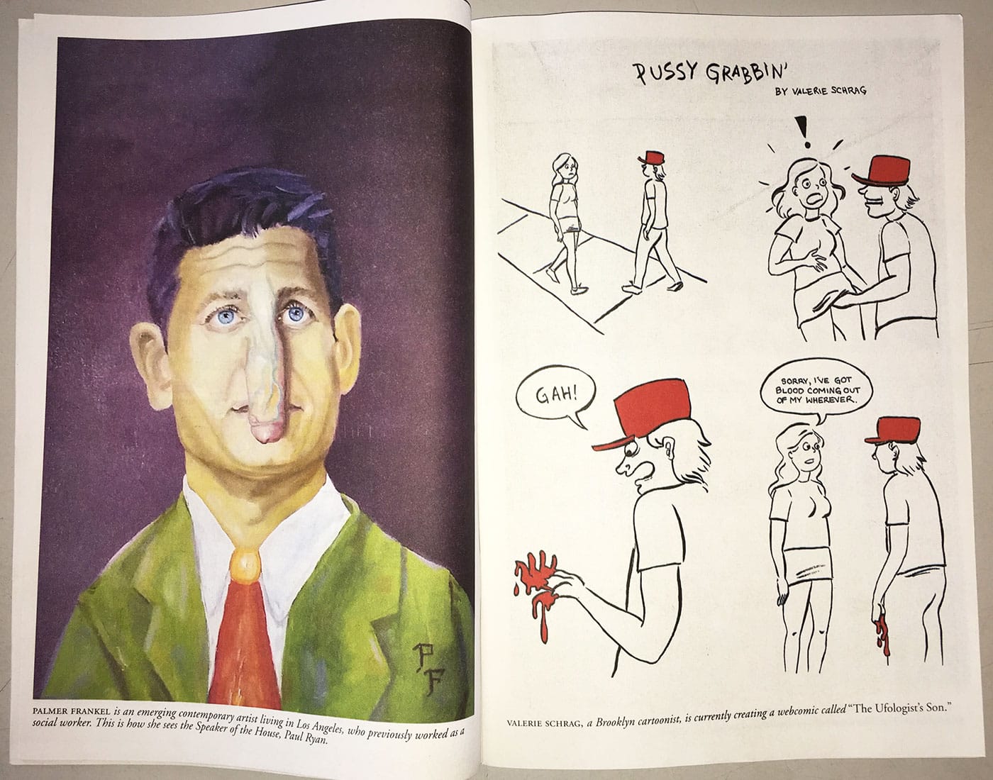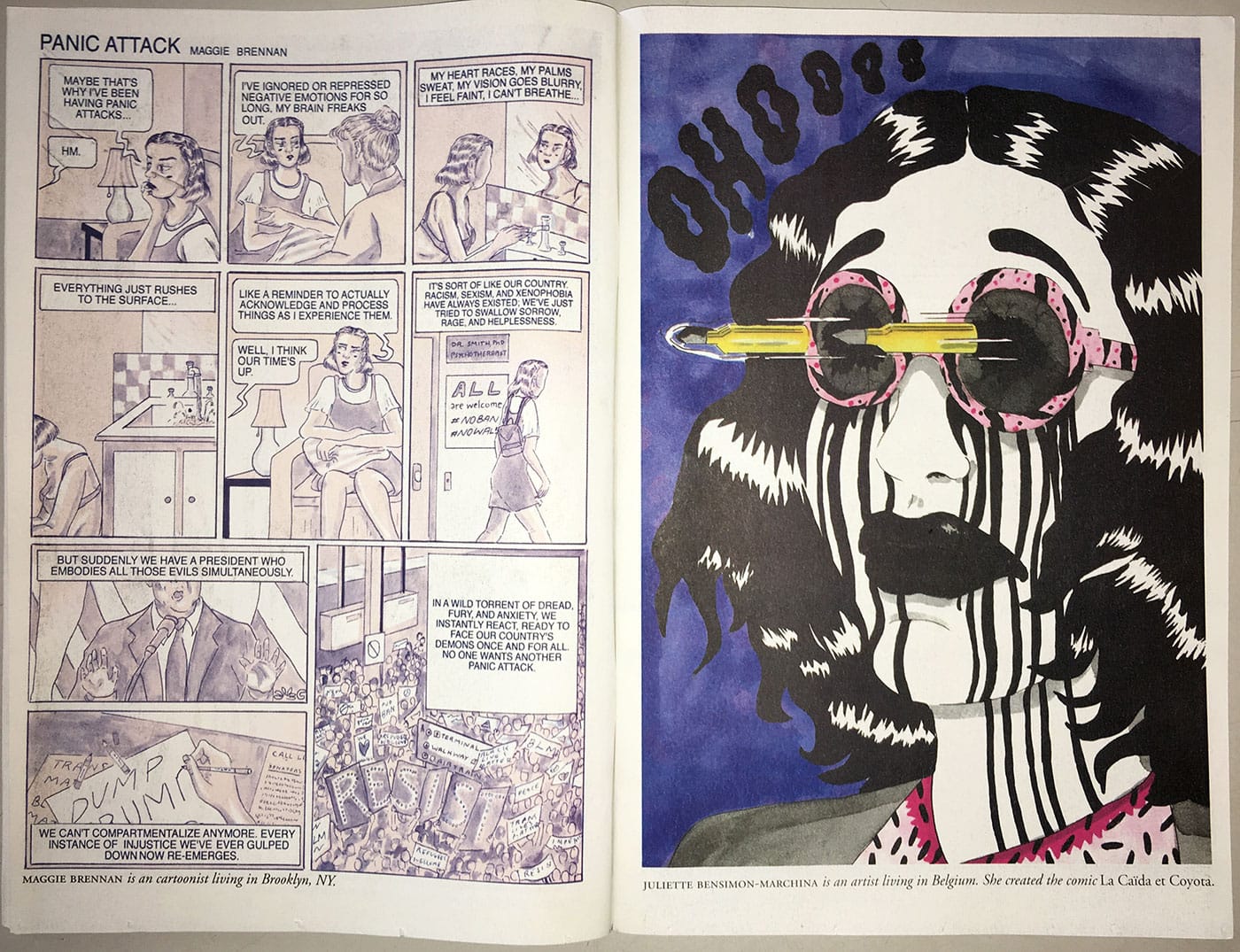 Nadja Spiegelman: I was in Paris, which was hard — I mean everything was hard, but it was hard to be so far away. The one thing I wanted was to hug my mother and then do something. One of the things my mom said to me in a moment of passion, when we were working on the project, was, “If I was a doctor, I’d be giving away free medical care; if I was a lawyer, I’d be at the airports. But I don’t know how to do any of these things, so I am making a magazine!” As soon as my mom mentioned it to me, I jumped at the chance. I grew up reading comics, surrounded by comics, and watching my mother face the incredible sexism of the comics world. I had felt like that sexism was something my generation didn’t have to deal with anymore, that it was over and we were ready for our first woman president. This was a major wake-up call that that was not the case, that there is still a lot to fight for.