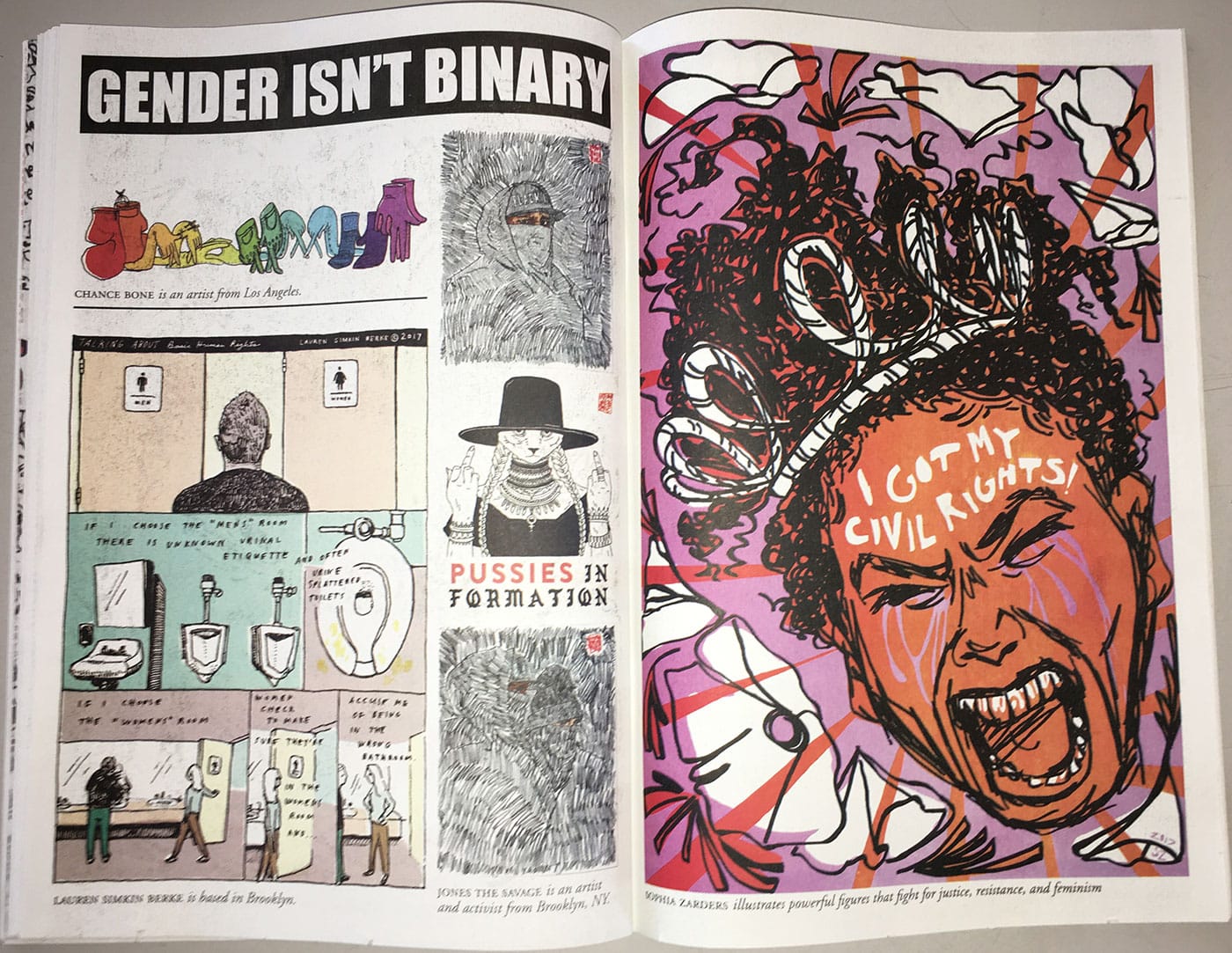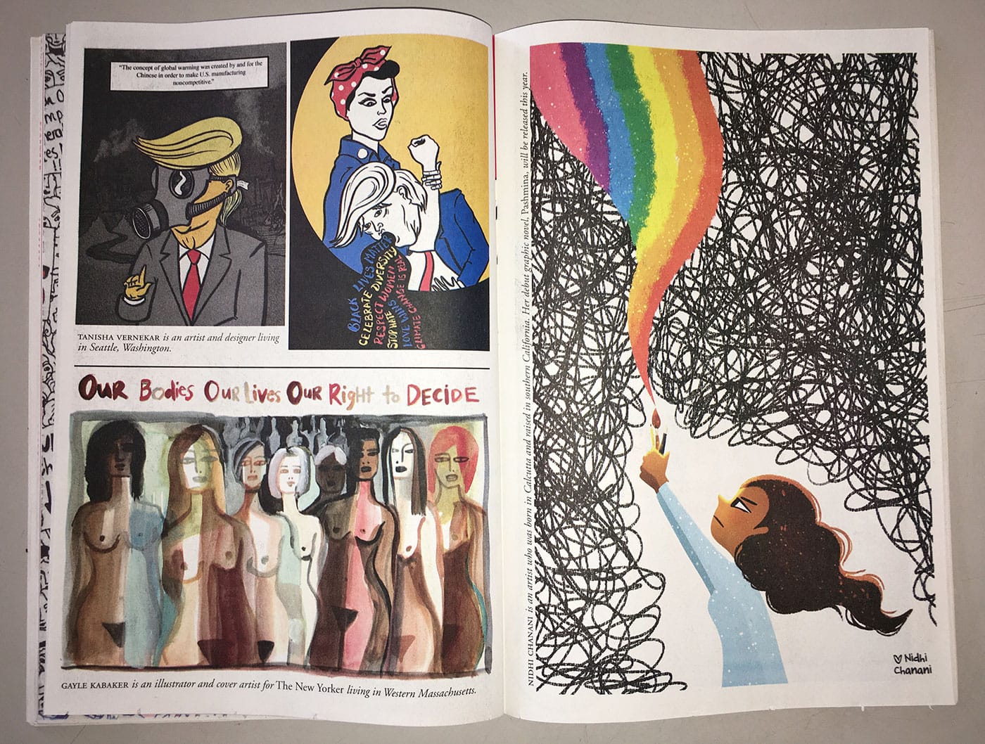 MNL: I guess that’s a silver lining. With issue two, the format is a bit different. It’s a smaller, more traditional magazine size, and it’s staple bound. The first issue felt very urgent to me, partly because it was newspaper size, with detachable pages that could become posters for people to hold during the march. Why did you change the format?