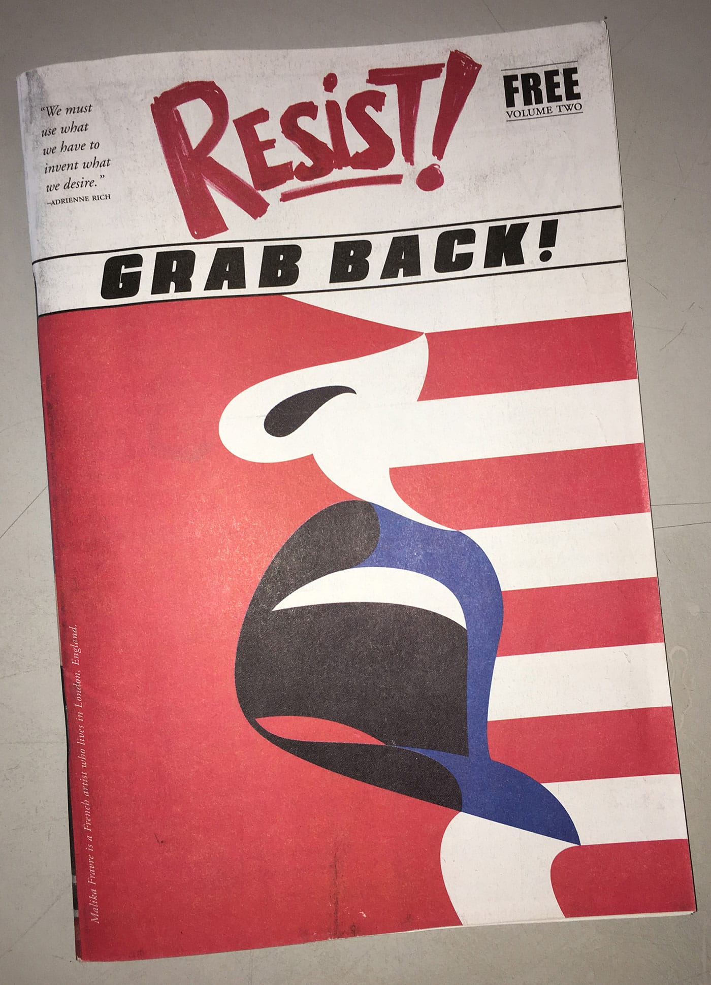 FM: RESIST! is refreshingly different in the sense that it’s truly a grassroots movement. We had no boss, no other entity to please, and we didn’t know what we wanted in the publication. We started with an envelope, and we had no idea what would be in it.