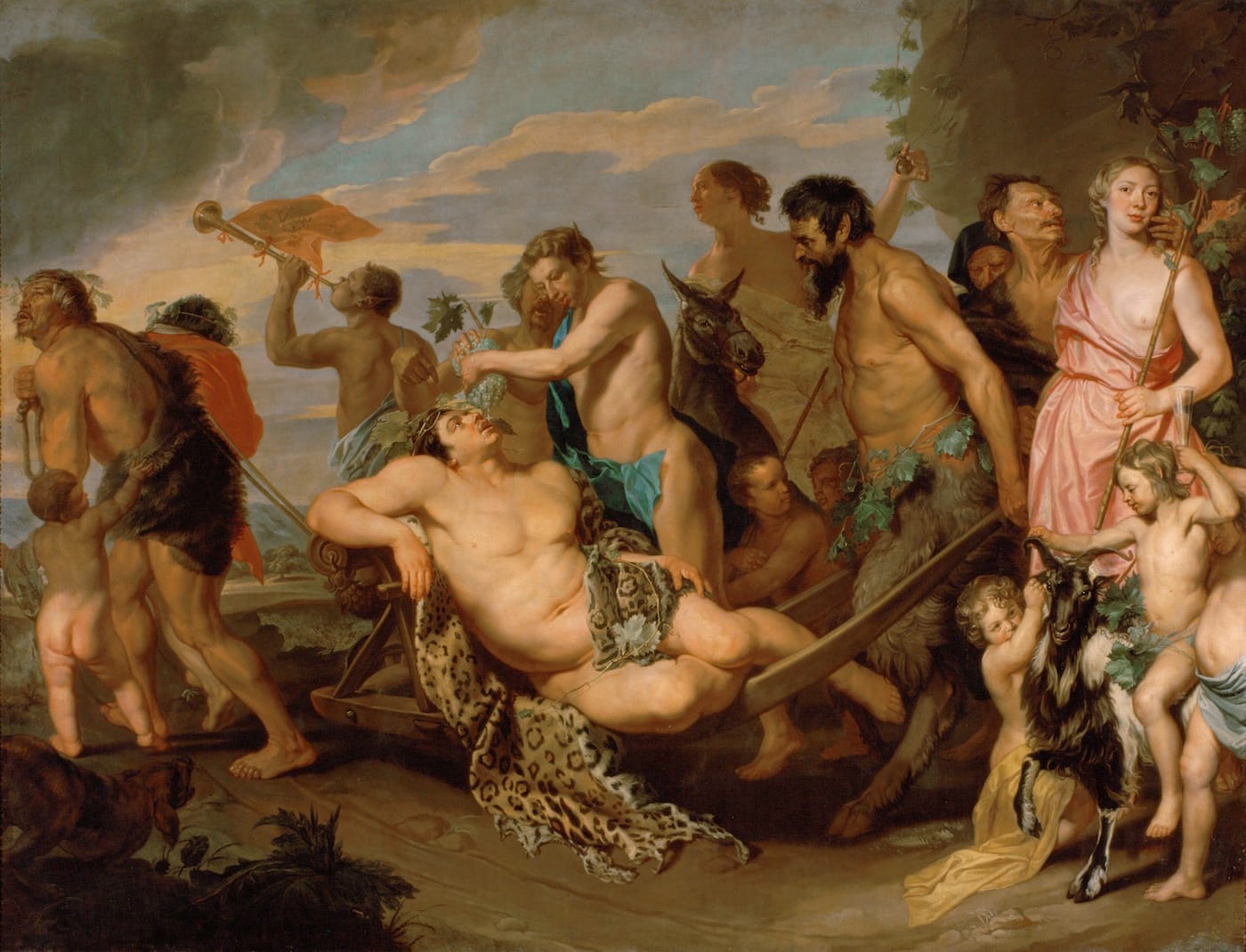 Bearing close similarities to commissioned portraits in style, scale, and bust format, religious figures such as “Saint Joseph” (ca.1650–56) or “Saint Joachim reading a book” (ca.1650–56) have added attributes, while “Study of a young man” and “Study of a young woman” have none. Curiously, for preparatory studies, these works are as finished as the other bust portraits. Larger historical work behaves in a similarly chameleonic manner: the monumental “Triumph of Bacchus” is as writhing and grotesque as any Rubens, though not surpassing, while “Annunciation” (1659) could fit right in with the 16th Century Baroque Annunciation canon. Wautier is remarkable for her unique assuredness across genres — perhaps a requirement for overcoming the limitations presented by her gender and obligation to fulfill a variety of commissions—and blends almost seamlessly with her contemporaries. An area where she can be said to really sing, however, is in her strong characterizations of her sitters; the youths pictured in “Everyone his fancy” and “Portrait of two girls as Saints Agnes and Dorothy” have an utterly charming treatment.