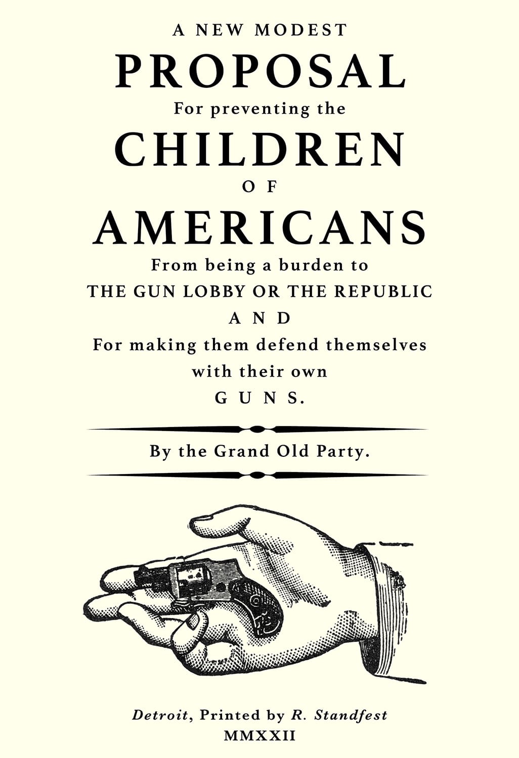 A graphic shows a trigger-ready hand cradling a palm-sized pistol. Standfest's print suggests that Republicans and the gun lobby hold a malicious disregard for the lives of the American children comparable to English colonizers’ indifference to rampant poverty and hunger in Ireland in the early 18th century — an indictment of a status quo in which the people come second to corporate interests and party politics.