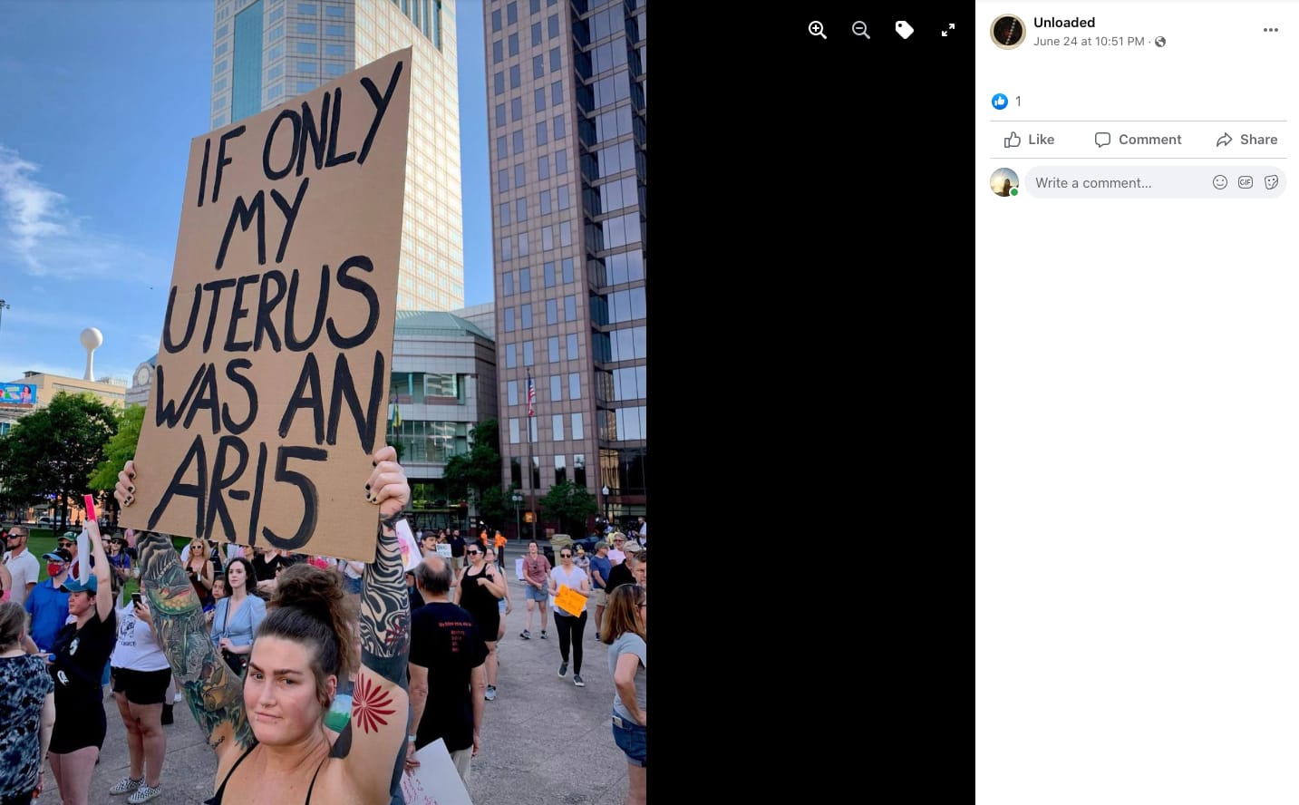 On the day the Supreme Court officially delivered its Dobbs ruling overturning Roe v. Wade, Slavick posted a photo of a protester carrying a plain cardboard sign reading, “If only my uterus was an AR-15.”