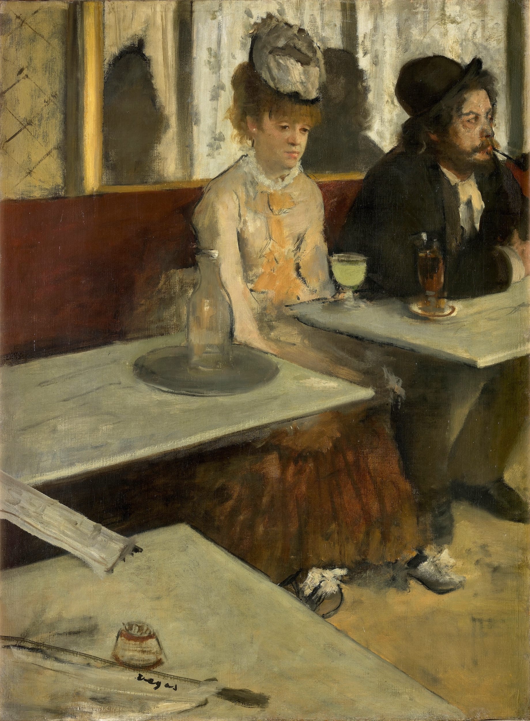The artists’ aesthetic incompatibility can be gleaned from the psychic distance between the daydreamer pictured in Manet’s “Plum Brandy” (c. 1877) and the stupefied demimondaine of Degas’s “In a Café (The Absinthe Drinker)” (1875–76). Could Manet have been trying to plant a flag in his own territory by painting a corrective, the pretty but stolid “Madame Manet at the Piano” (c. 1868–69), while “Monsieur and Madame Édouard Manet” was still in his possession?