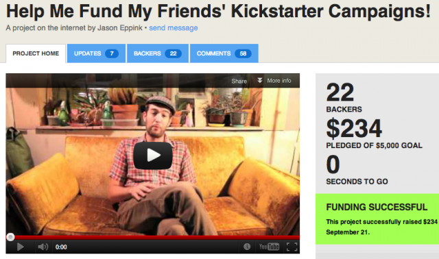 The panel skirted around the discomfort of hounding friends for money, many of whom are probably as broke as the originating artist. Most artists are probably already familiar with the discomfort of have 10-plus friends asking you for money while you yourself are looking for something resembling steady work. Jason Eppink did a fantastic parody of this whole process with a mock-Kickstarter project, “Help Me Fund My Friends’ Kickstarter Campaigns!” (seen below) Commodifying our friendships felt more and more like a real danger the longer this talk went on.