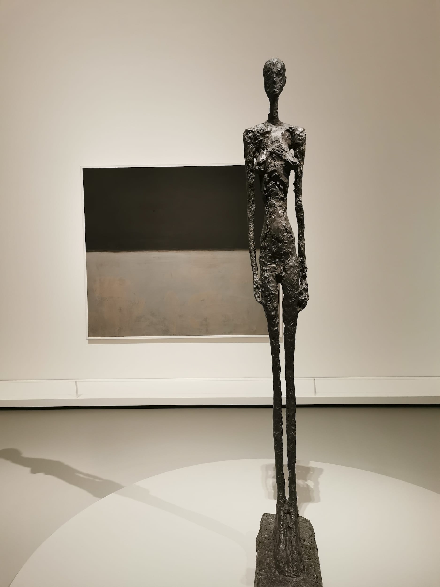 Up one final level and we enter the 1960s, the decade in which he had two major commissions — the more important being the Rothko Chapel paintings in Houston (1964–68), sponsored by the de Menil family, continuing with his focus on dark colors. Only a model of the chapel appears in the exhibition. None of its 18 paintings are present, even though four are alternates and surely could have been lent. The other commission was for UNESCO headquarters in Paris in 1969, but this too he eventually declined, though his Black on Gray paintings are arranged here in Gallery 10, along with two sculptures of human figures by Alberto Giacometti, to evoke the UNESCO project.