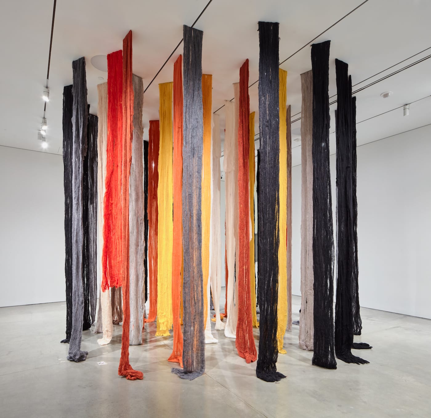 Born in Santiago de Chile in 1948, as a teenager Vicuña would begin fusing feminist art praxis with indigenous tradition, performance with conceptual art, and art objects with an outpouring of poetry. Though her early work dialogues with the promise of a socialist Chile, when she went to pursue an MFA in London, she would remain there, exiled by the dictatorship of Augusto Pinochet, which extended from 1973 to 1990. In exile, Vicuña would craft many modes of political resistance, ranging from over 400 precarios to quipus (“talking knots”), Incan record-keeping devices woven from colored wool and punctuated by knots. Created especially for the BAMPFA exhibition, Vicuña’s “Burnt Quipu” (2018) evokes smoke through its filaments, alluding to forest fires from California to the Amazon to the Boreal Forest to Chile and beyond. Textual textiles, the quipus were once read by touch.