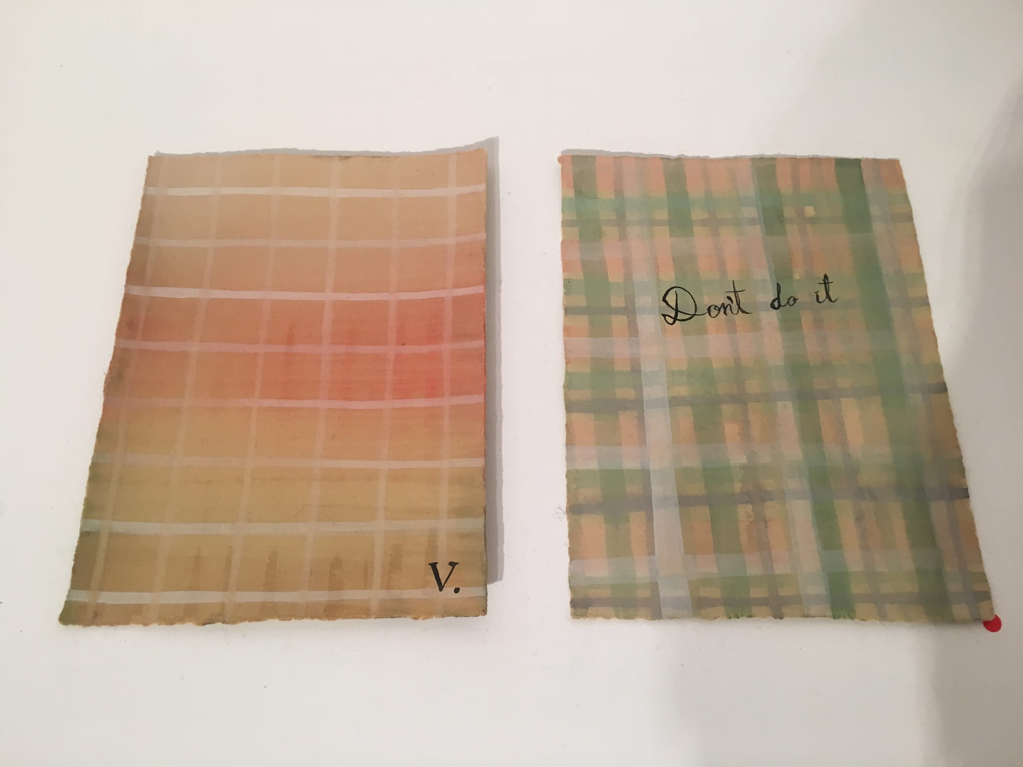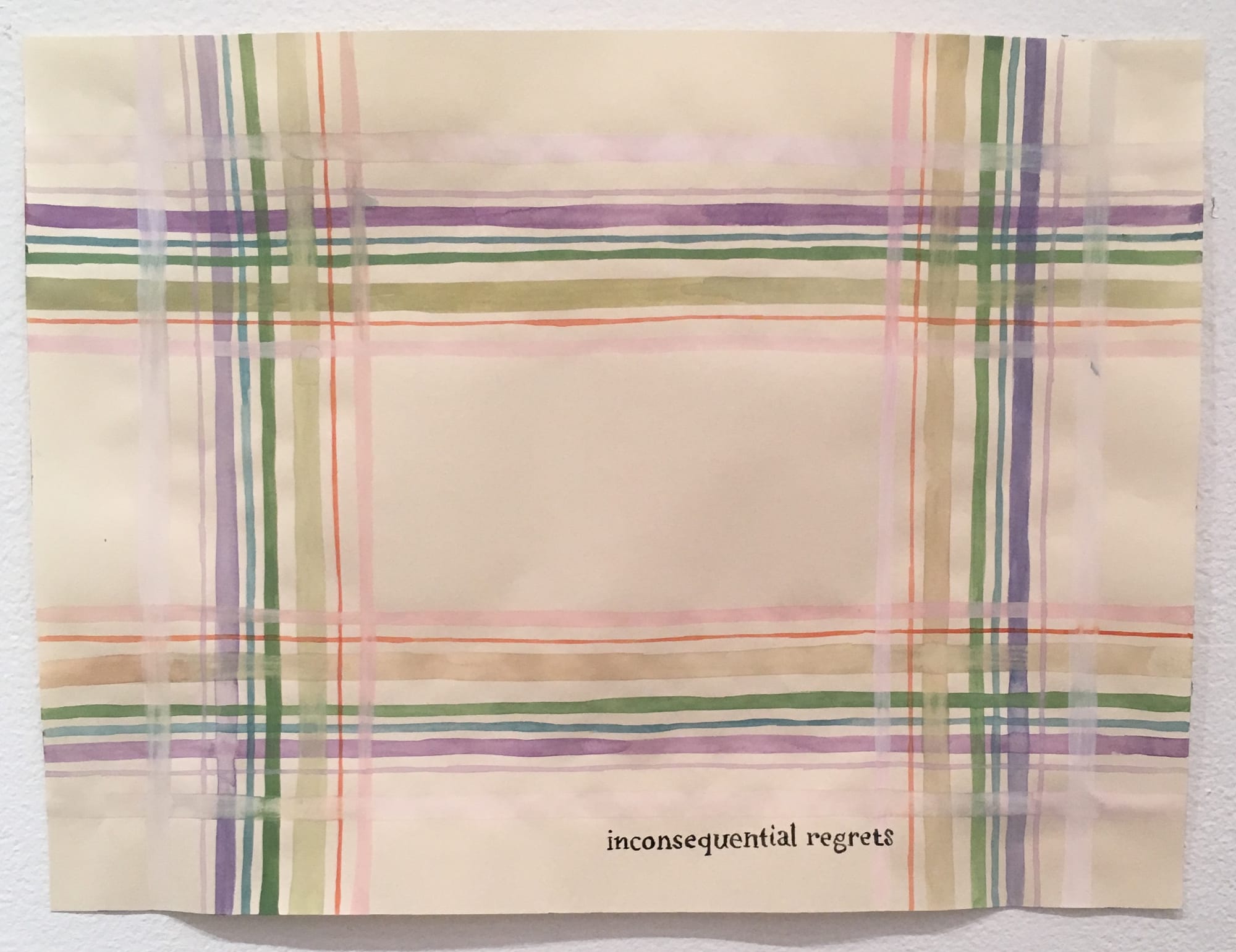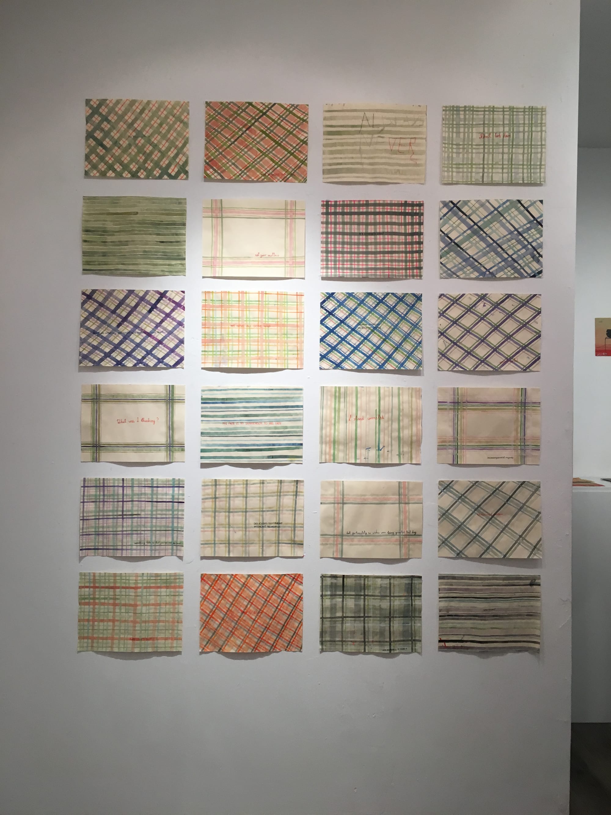 From a distance, Julia Kuhl’s watercolor “Domestic Textile Series,” in frosch&portmann’s small, one-room gallery, evokes the interiors of 1920s women’s sitting rooms. Kuhl’s works employ a visual language that is traditionally seen as feminine; she paints plaid and striped decorative patterns on small, rectangular pieces of paper. But a closer look at the paintings reveals something more nuanced. Each watercolor features clearly articulated lines of text in lowercase serif or elegant script. These lines are far from the sayings crocheted on a grandmother’s pillow. Sourced from songs, poems, or Kuhl’s dreams, they are sassy, tongue-in-cheek quips like, “I BEG YOUR PARDON” and “are these the good times?” The 24-plus paintings in her current show, I forgot what you wanted, build on the history of women’s craft arts, suggesting needle point patterns and sewing, while questioning women’s traditional and still-presumed societal roles.