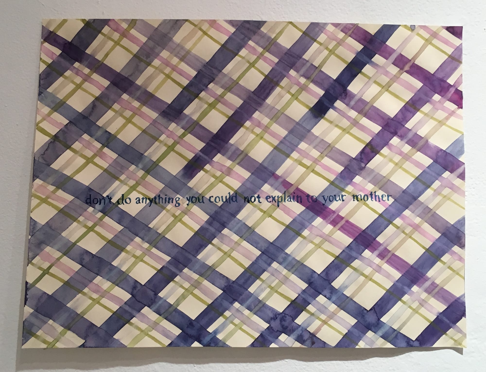 While many are funny and provocative—for instance, a pastel green and pink tartan print that reads “not your mother” in red script along the bottom or one that reads “I am accustomed to inspire nothing but virtuous sentiments” in small serif font against muddy splatters of paint—others are more troubling, alluding to the ways women’s personal, professional, and sexual boundaries often go broadly unacknowledged. This is particularly clear in works like a 2019 painting that reads “don’t do anything you could not explain to your mother,” neatly printed on a lovely, bright purple plaid, which reads as an external or internal reprimand of women’s sexuality, or “Disappoints” (2019) with the phrase, “Disappoints but does not disappear,” which recalls failed relationships and the myriad of situations women enter into earnestly, only to be disappointed.