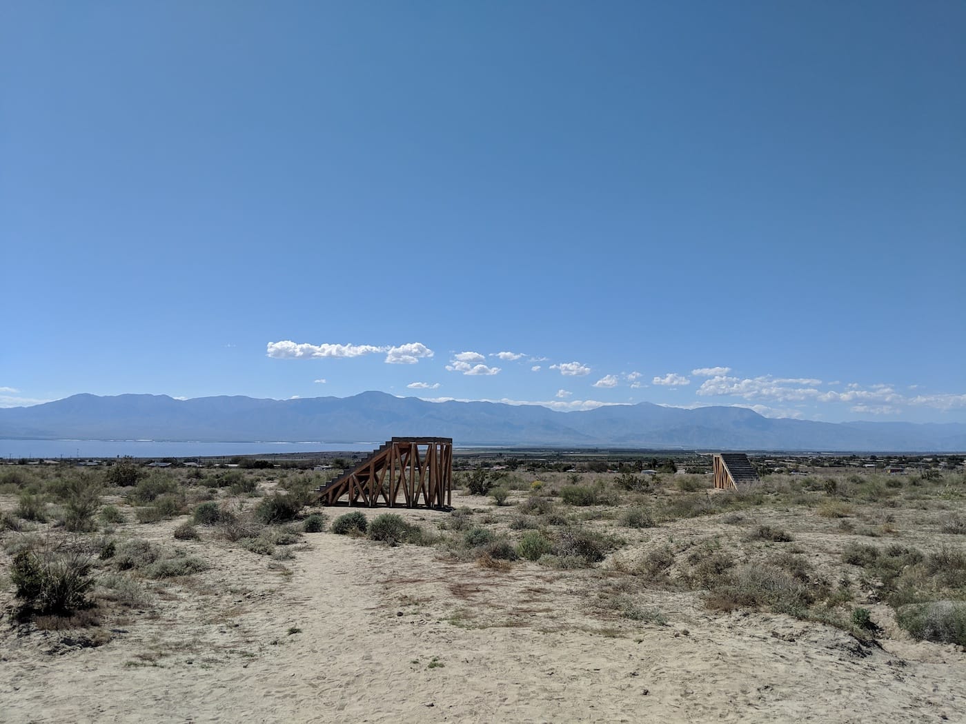 Look east from one of the five platforms and you’ll see one very real “layer”: the sculptural, colorful silhouette of the North Shore Community Park, designed by residents, fought for over years, and eventually opened in October 2018, only to be closed a week later due to a devastating storm. “We had to show that it was still important for the community to have this safe public space,” Noelle Furon of the Desert Recreation District told the Desert Sun after the storm, recalling how hard the park had been to fund. The park should finally reopen in July of 2019, but it is pragmatic realities like this that certain community members wish Desert X organizers and artists had better acknowledged. “Communities should be involved in that, the artists should have to go to the community,” said Kariotis. “How can we fix this so that residents don’t feel put upon and we can bring awareness to what we’re fighting for out here?”