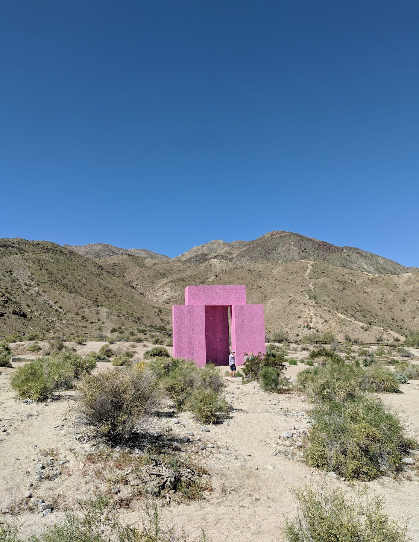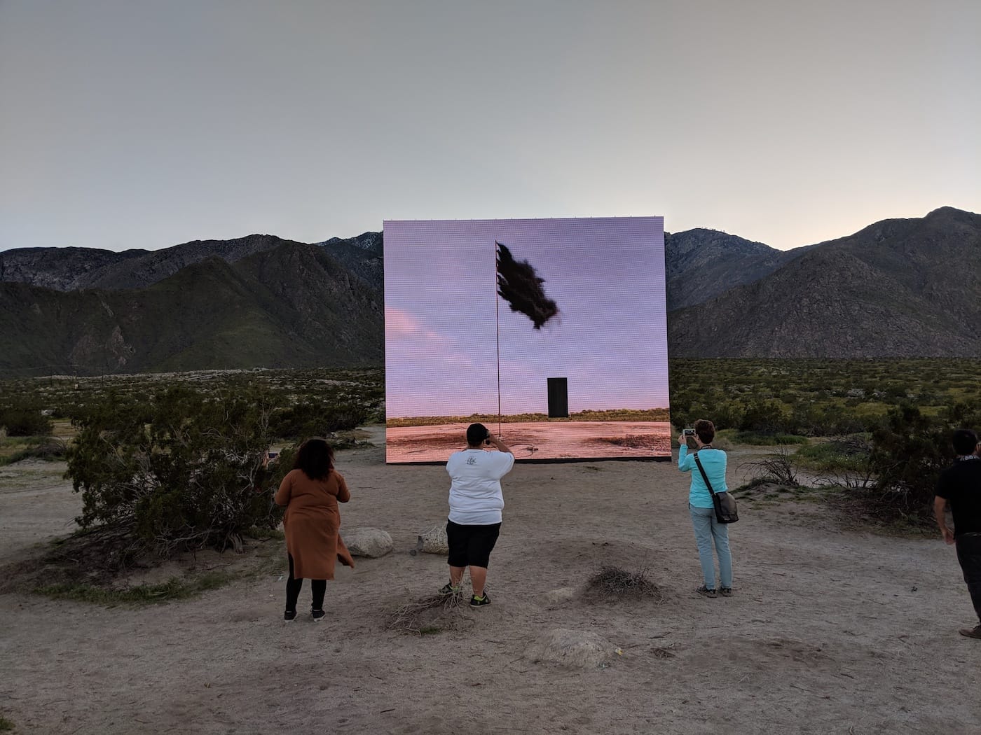 One work at the entrance to Palm Springs, John Gerrard’s “Western Flag” (2017), a gigantic, generator-fueled LED screen showing a flag pole spewing black smoke (made to critique our irresponsible use of resources), was shut off due to cost on March 30. The Wildlands Conservancy rescinded permission for a proposed Jenny Holzer projection at the Whitewater Wildlife Preserve over concerns that it would disturb ailing bighorn sheep. A two-story-high sculpture by the Danish collective Superflex worried residents who live around its location, the Cap Homme / Ralph Adams Park in Palm Desert. Ruth Nolan, a writer and environmental advocate who lives near the park, posted on Facebook as Superflex installed their sculpture “Dive-In”: “They’ve carved out an ugly dirt road through the creosote,” referring to the brush along the park’s floor. The sculpture, colored to match the endangered coral reef and the coral homes in resort-filled Palm Springs, resembles a drive-in theater but also could, hypothetically, encourage the rebuilding of the coral reef if the desert were ever, in the far future, once again turned to sea and the artwork discovered by fish. Rasmus Nielsen of Superflex explained over email, “certain species involved in building coral reefs are attracted to pink and the foam-like structure would constitute the perfect starting point for them to live in.” But the sculpture’s potential effects on species remain unproven, and for now, it is an aluminum monolith in a delicate habitat.