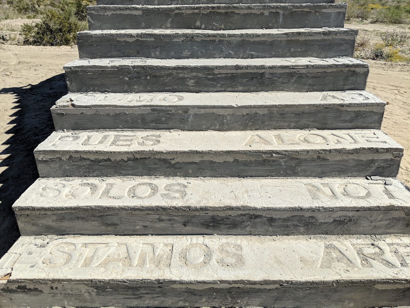 Less than a mile east of the service station briefly home to Eric Mack’s “Halter,” Ivan Argote’s “A Point of View” rises out of a sandy plot of land. Comprised of five staircases arranged in a loose arc, the artwork has a surreal, precarious quality. The stairs, made of wooden scaffolding and concrete that has begun to crumble, are each just over a story high and words engraved on each step become messages: “We are not guilty. It’s not about that. It’s about taking care of each other,” and “This place had no name, then it had many.” The Bogota-born, Paris-based artist said on the Desert X podcast that climbing the staircase is about “enjoying the landscape and, at the same time, […] raising consciousness about how we are all part of this and there are so many layers.”