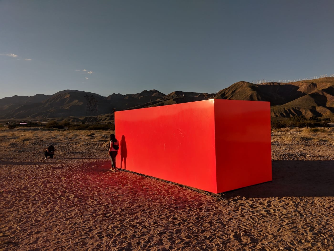 Since its founding, Desert X has been a weird vehicle for Westward Expansionist rhetoric. The catalogue and press releases teem with striking examples, for instance: “Since biblical times the desert’s allure has resided in the fact that we go to it not knowing what we are looking for […].” Susan Davis, the biennial’s Palm Springs-based founding president, said at the inaugural press conference in 2017 that her goal was for everyone to “learn more about the desert and how beautiful the desert is.” This year, in her opening letter in the catalogue, she stayed on theme: “participating artists were profoundly moved by this special place.” Certainly, since hardly any are from the area, they had every opportunity to be moved. In 2017, two participating artists — Palm Desert-based Phillip K. Smith III and East Coachella Valley’s Armando Lerma — were desert locals. This year, in the iteration co-curated by Amanda Hunt and Matthew Schum, with Wakefield overseeing, only one of the 19 artists is, and he participated last time: Lerma, again contributing a mural.