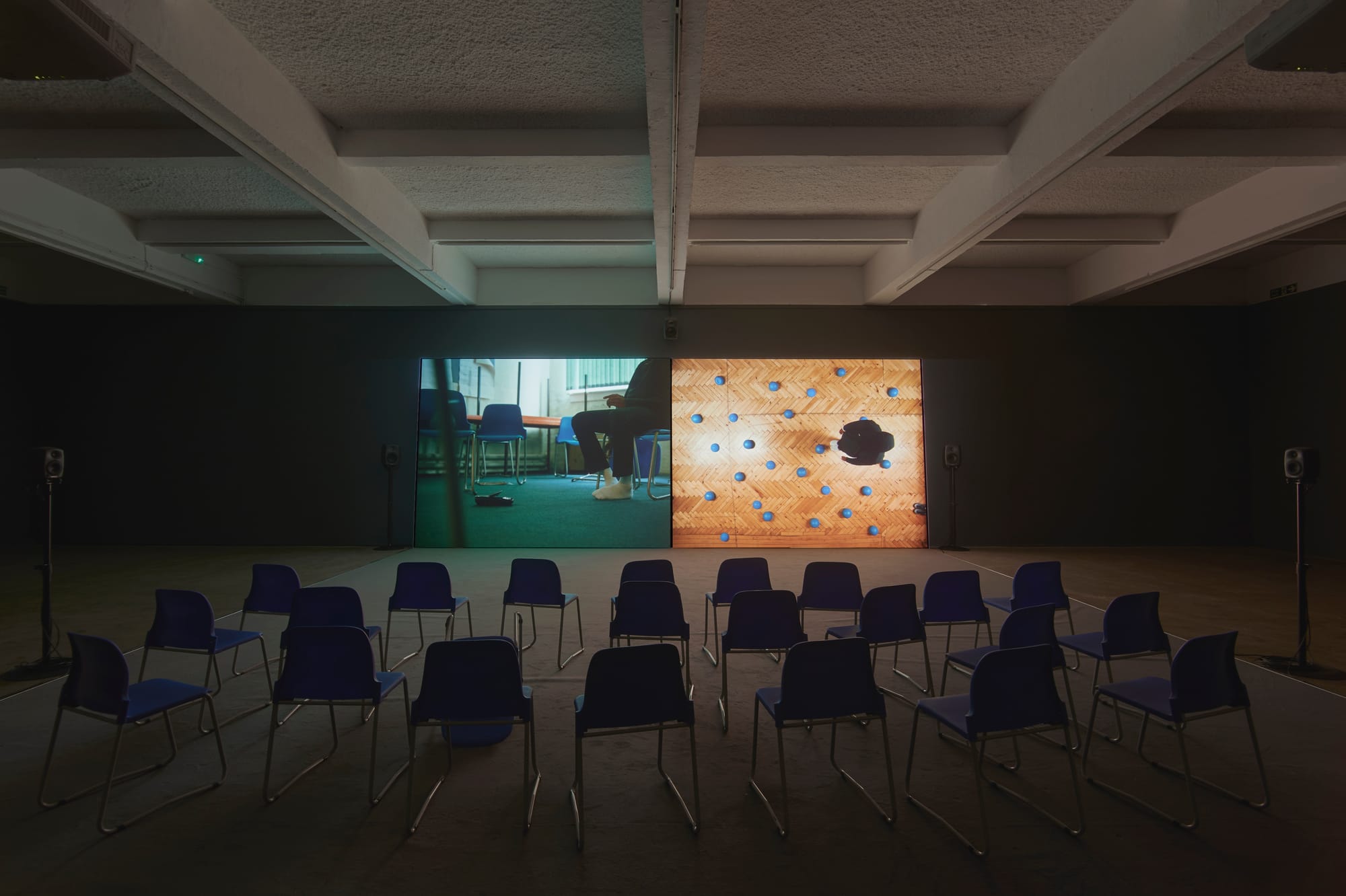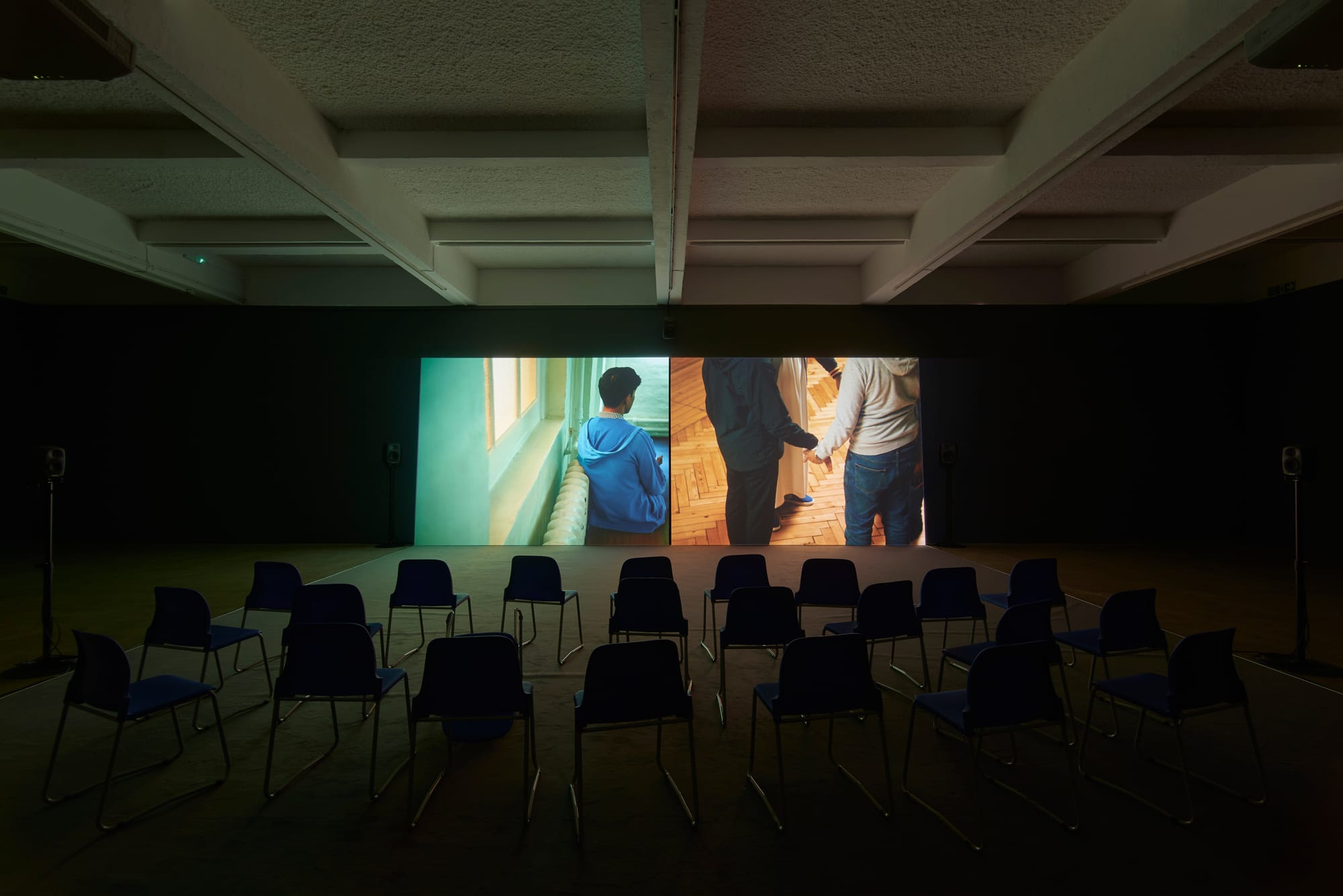 Perretta films these interviews like interrogations, lingering on the backs of his subjects’ heads and using high-angle vantage points to express the sensation of being both under-protected and overexposed. Presented across two screens, these monologues are disrupted by moments of magical realism. There is dreamlike imagery of the community center filling with black smoke and water. Perretta understands the role that images of violence and urban deprivation have played in dehumanizing Muslims, so he instead uses visual effects to suggest the threat that hangs over these men. By not showing the physical reality of violence, he invites the viewer to consider how external factors, such as the draconian austerity measures implemented by the UK’s coalition government, have resulted in the erosion of public spaces where Muslim men can feel safe.