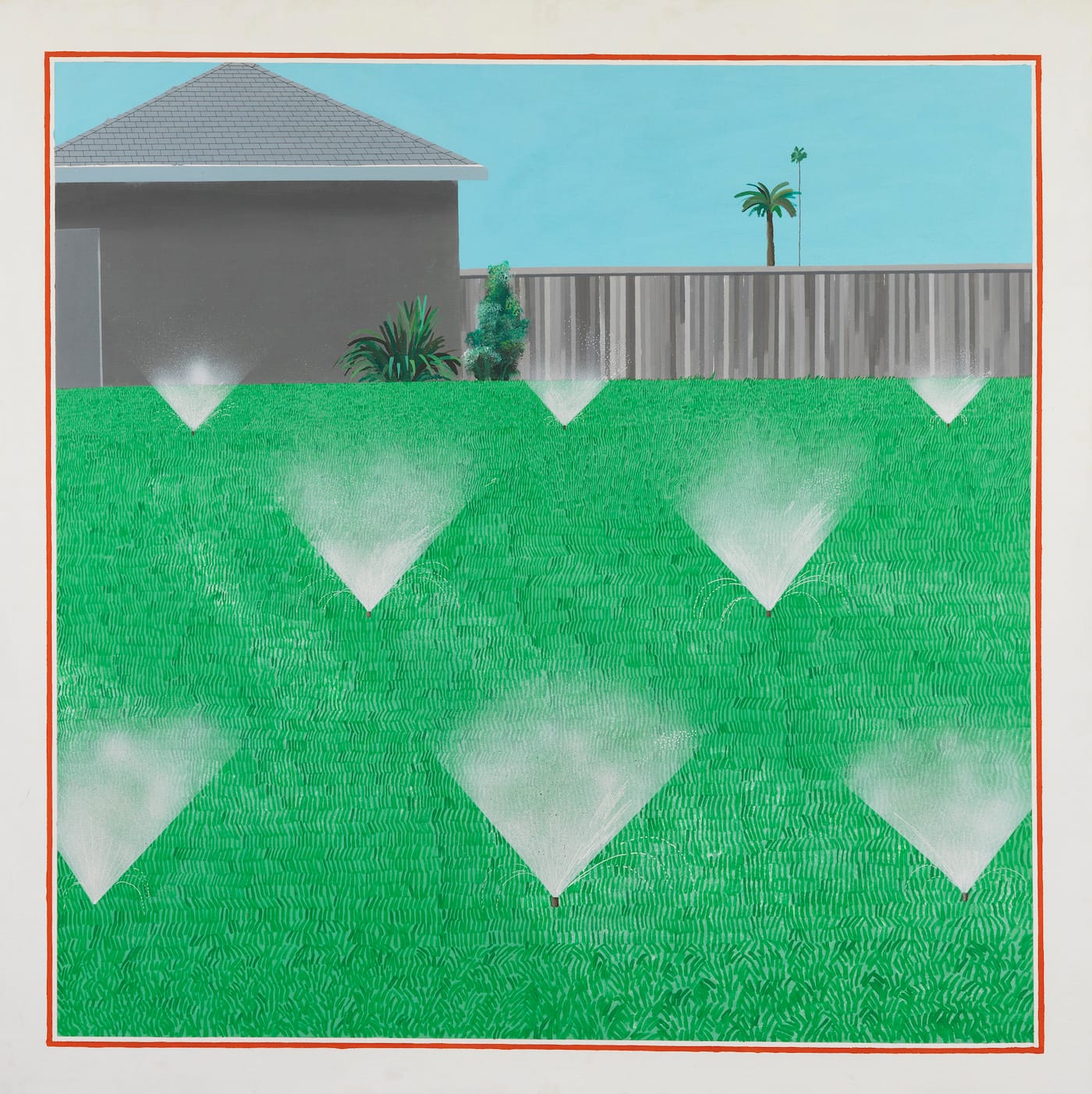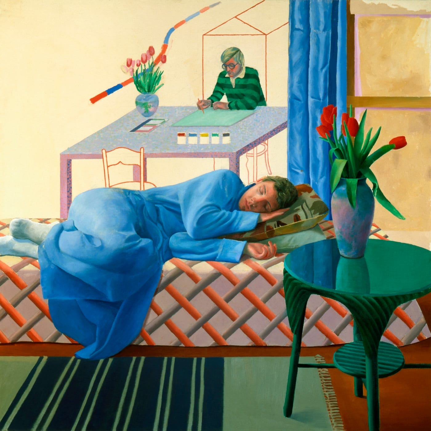If all this sounds terribly detached and unemotional, that’s because Hockney’s technical skill is quite clearly completely effortless and natural — almost unbelievably so. His confidence of line and economy of modeling means that painting, for him, presents no struggle whatsoever, hence the room for complete focus on its means to explore intellectual ideas. Such formidable talent is evident in some iconic portraits, lending that distinctive 1960s coolness: “Mr and Mrs Clark and Percy” (1970–71); “American Collectors (Fred and Marcia Weisman)” (1968). The famous LA paintings, including “A Bigger Splash” (1967) and “Portrait of an Artist (Pool with Two Figures)” (1972), strip all modeling down to its bare minimum, using precision of line, color choice, and composition that make it all look so still, easy, and unforced. These are presented again in terms of artistic theory — we are invited to observe their use of pictorial framing, and, yes, you probably never noticed that the sensational “A Bigger Splash” has an enormous expanse of unpainted canvas left as a framing device — but their visual punch nonetheless goes straight to the gut.